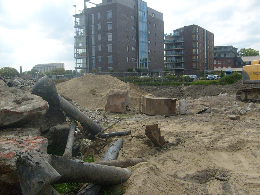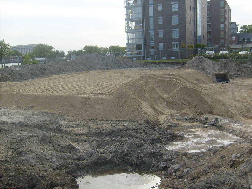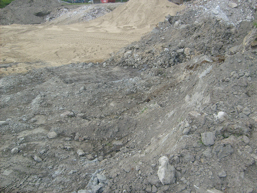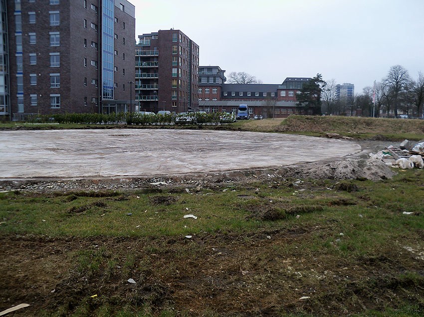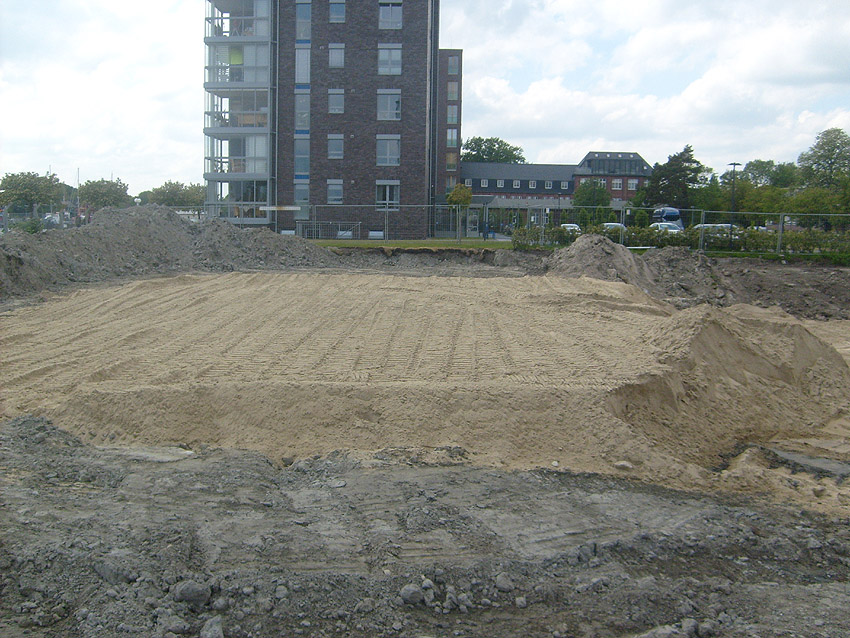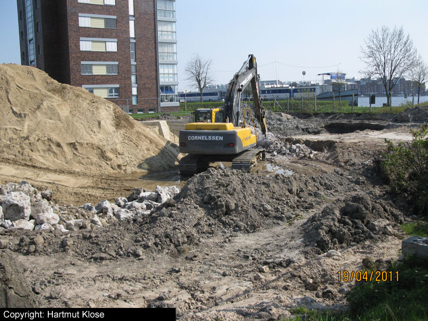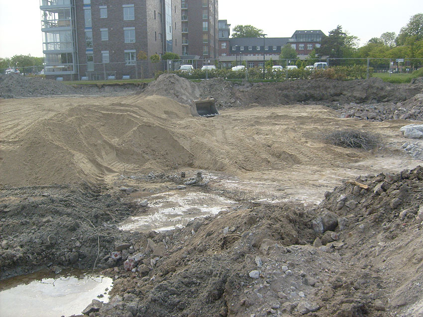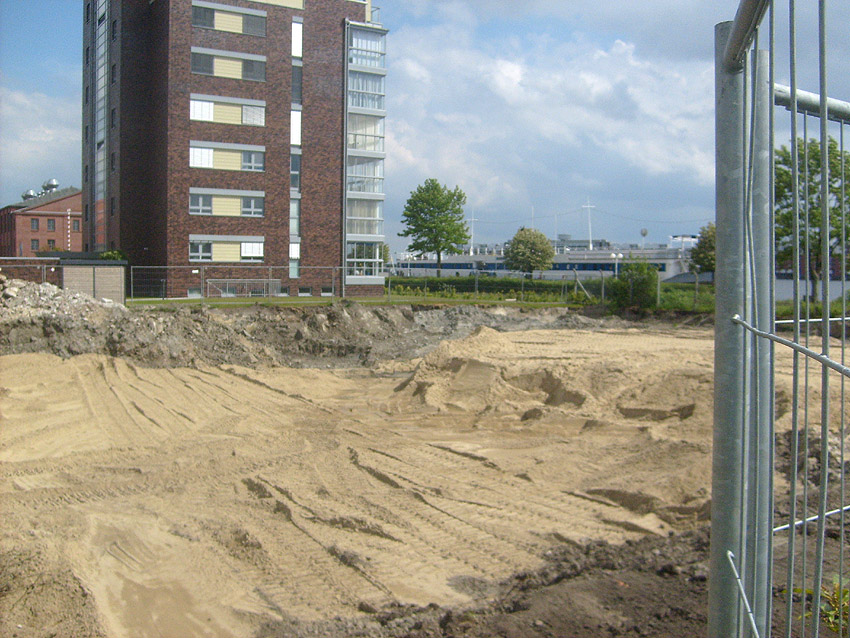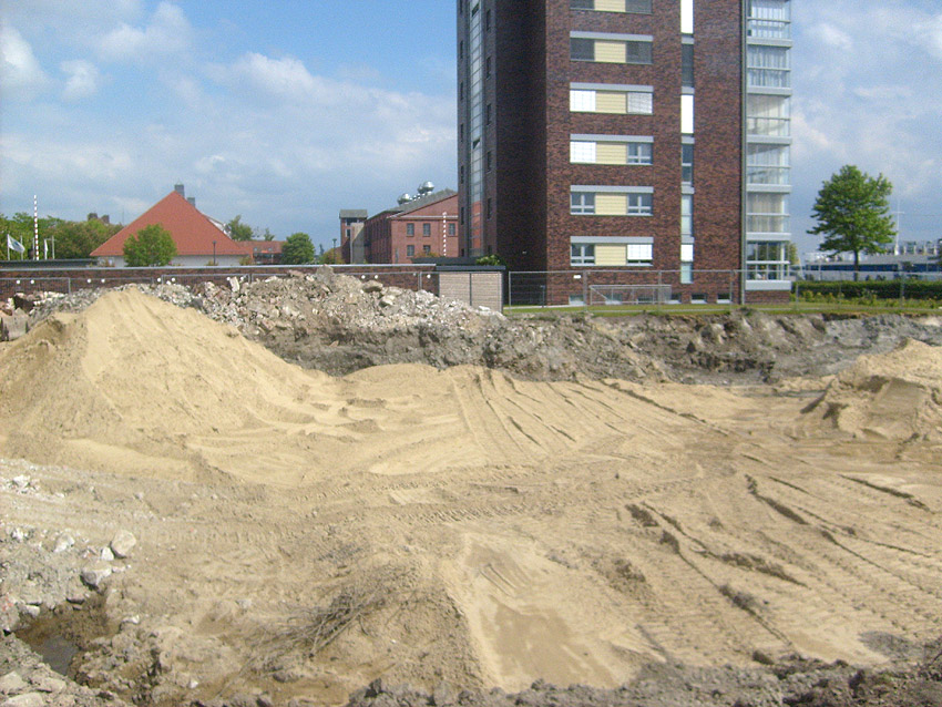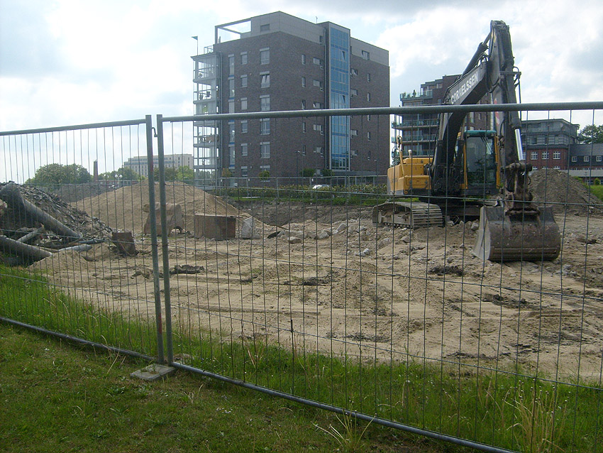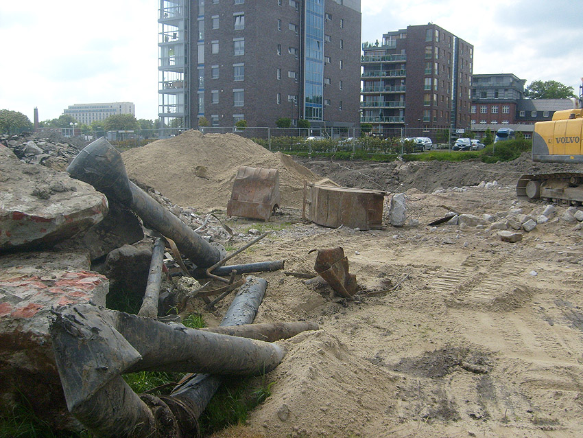 Erste Aktivitäten auf der Baustelle, das Erdreich südlich des Fundamentes wurde mit etwa einem Meter Tiefe entfernt und auf dem Fundament abgelagert. Diverse Rohre und andere Metallgegenstände, Relikte aus der Vergangenheit, wurden unter Erdgleiche aufgefunden. Ein leicht öliger Geruch ist am Gelände wahrzunehmen.