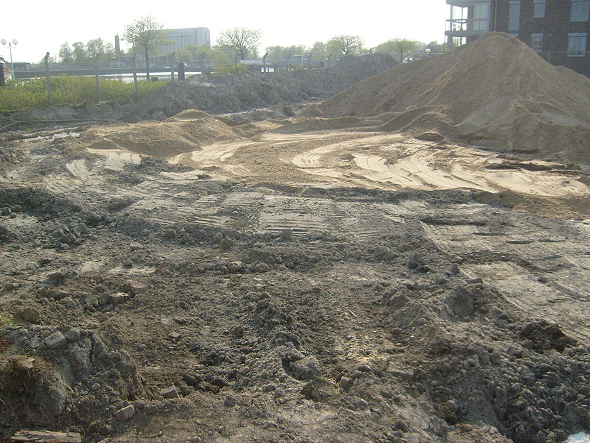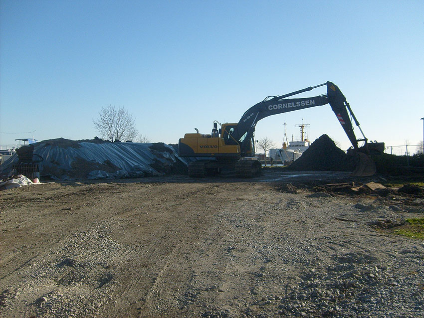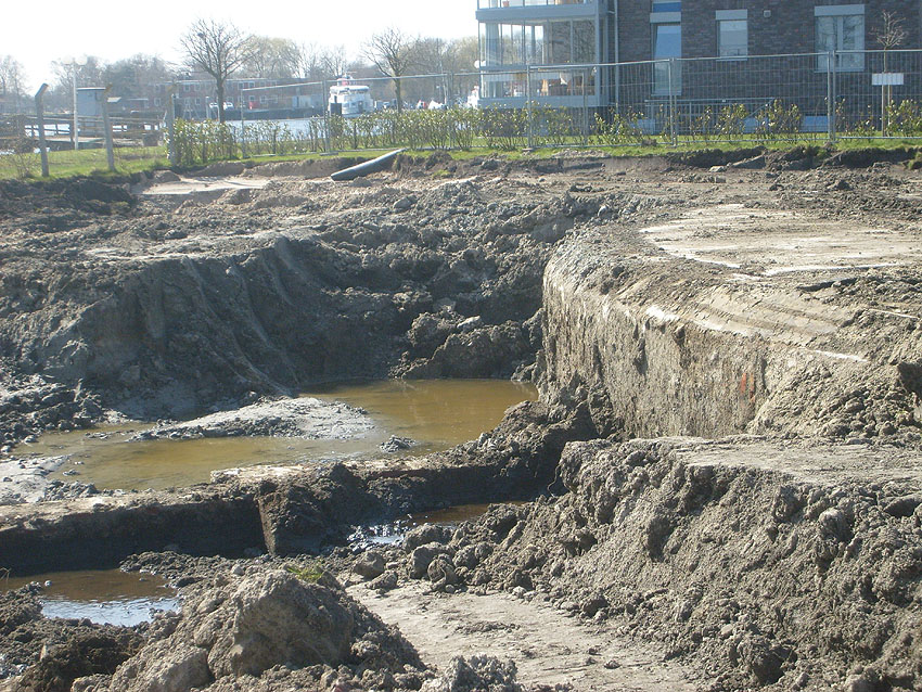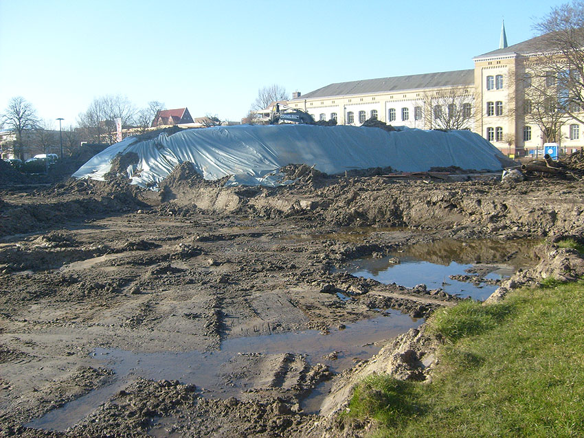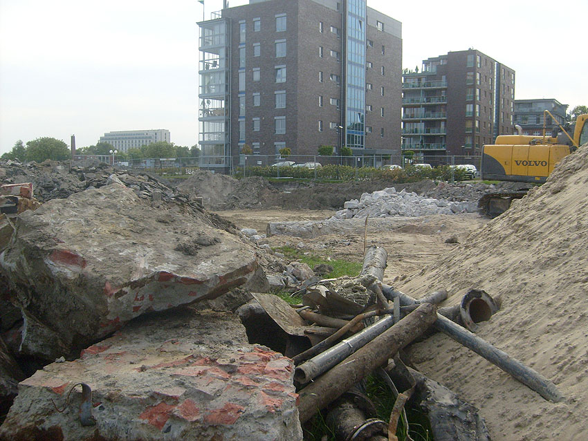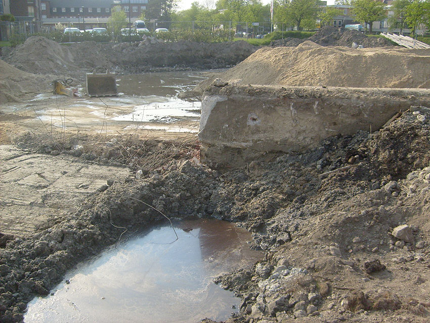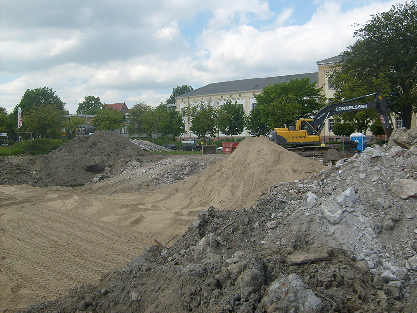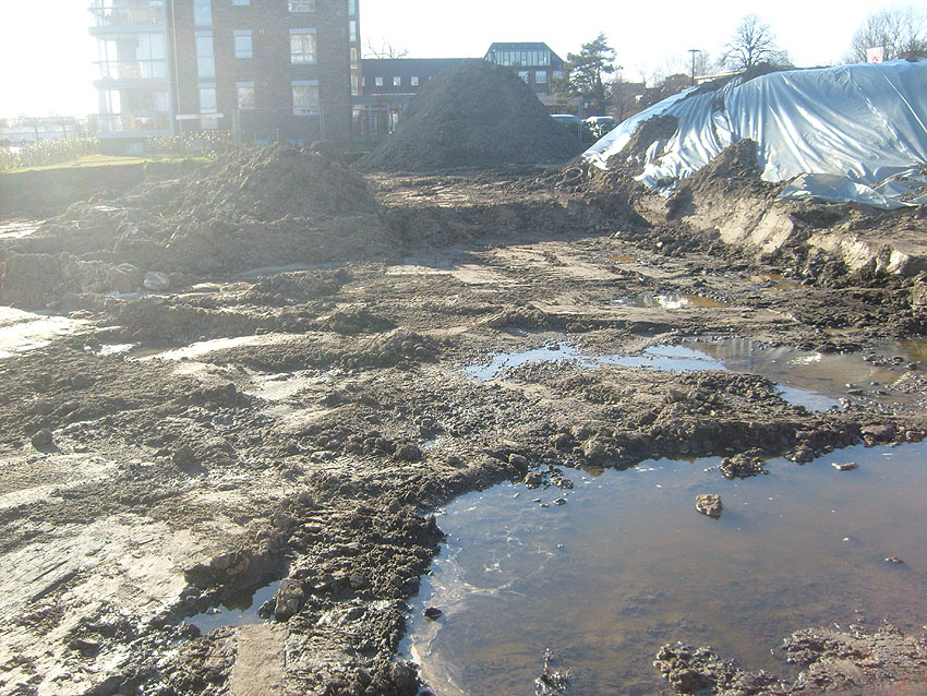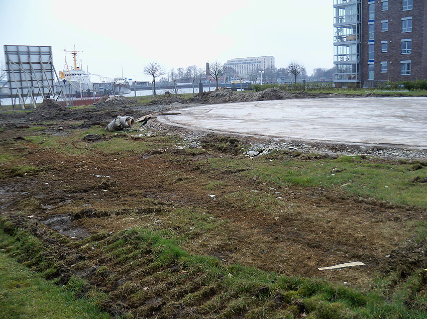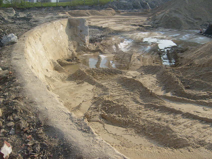 Erste Aktivitäten auf der Baustelle, das Erdreich südlich des Fundamentes wurde mit etwa einem Meter Tiefe entfernt und auf dem Fundament abgelagert. Diverse Rohre und andere Metallgegenstände, Relikte aus der Vergangenheit, wurden unter Erdgleiche aufgefunden. Ein leicht öliger Geruch ist am Gelände wahrzunehmen.