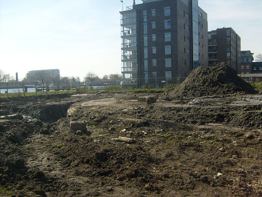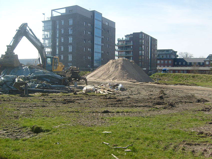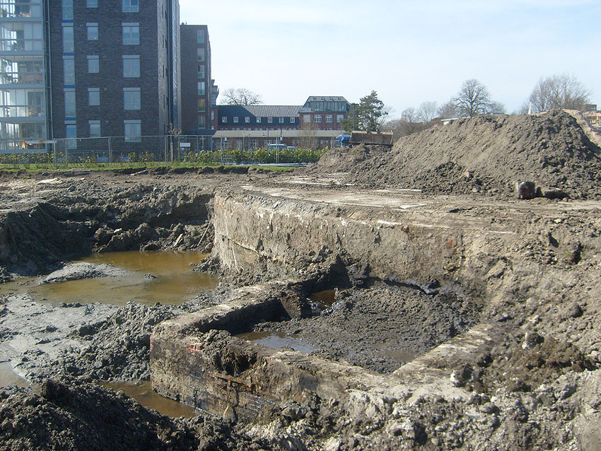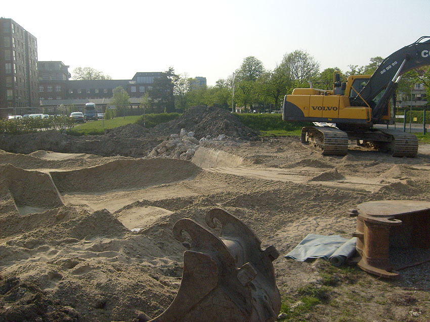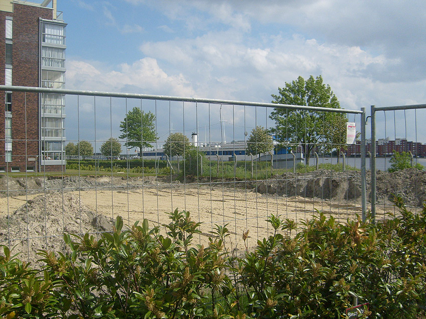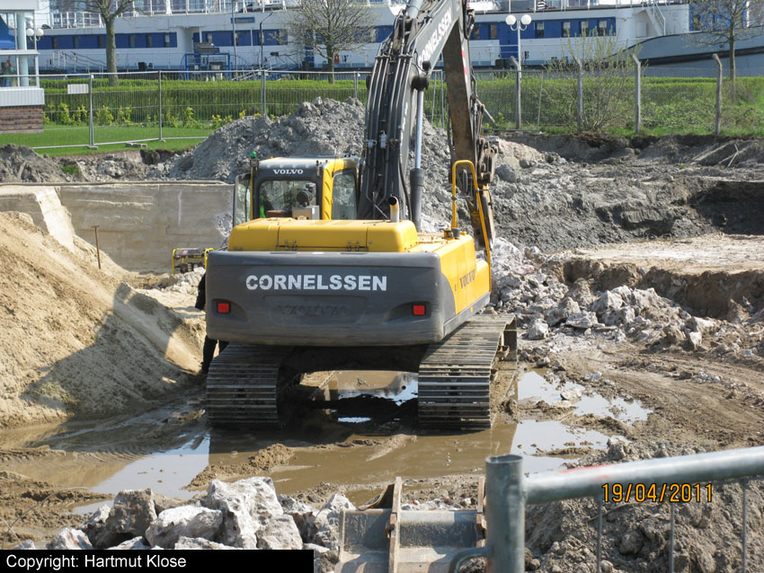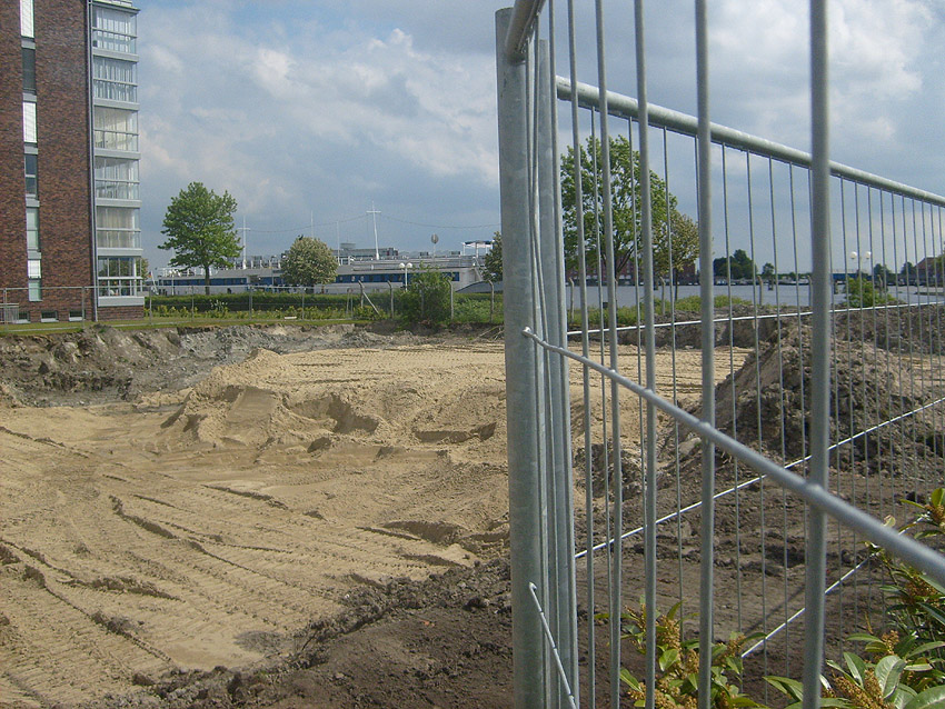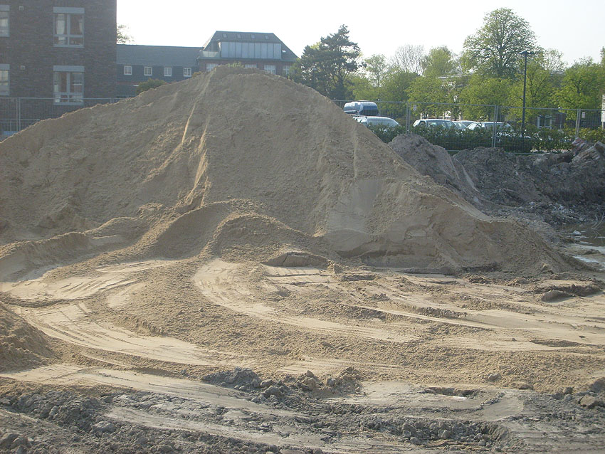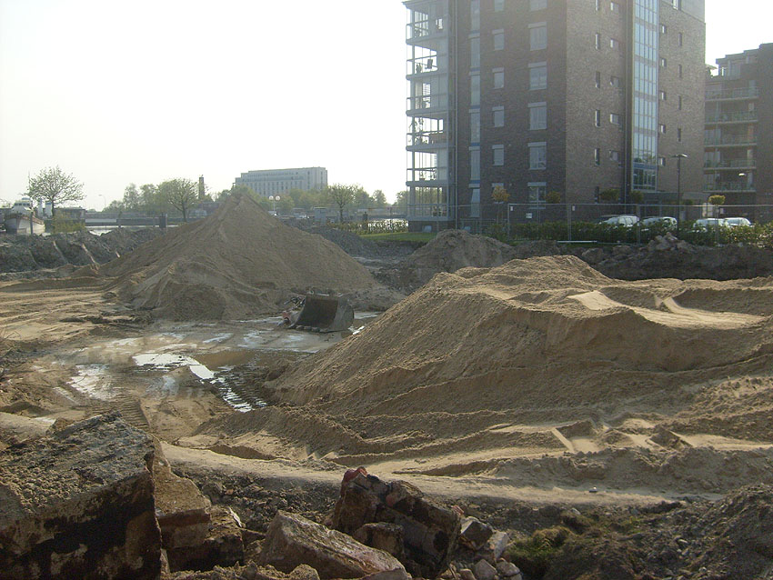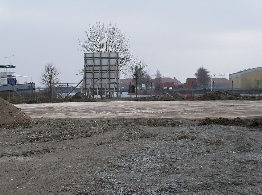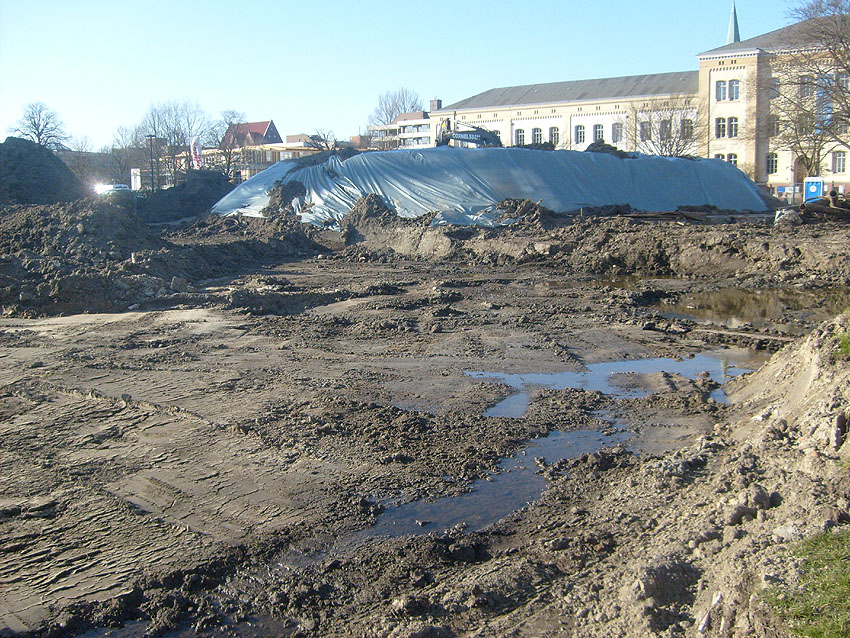 Erste Aktivitäten auf der Baustelle, das Erdreich südlich des Fundamentes wurde mit etwa einem Meter Tiefe entfernt und auf dem Fundament abgelagert. Diverse Rohre und andere Metallgegenstände, Relikte aus der Vergangenheit, wurden unter Erdgleiche aufgefunden. Ein leicht öliger Geruch ist am Gelände wahrzunehmen.