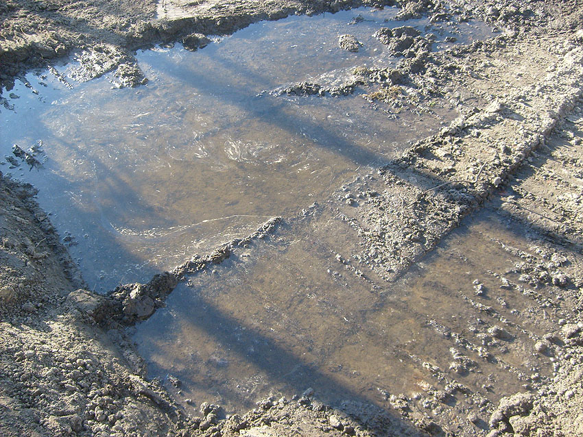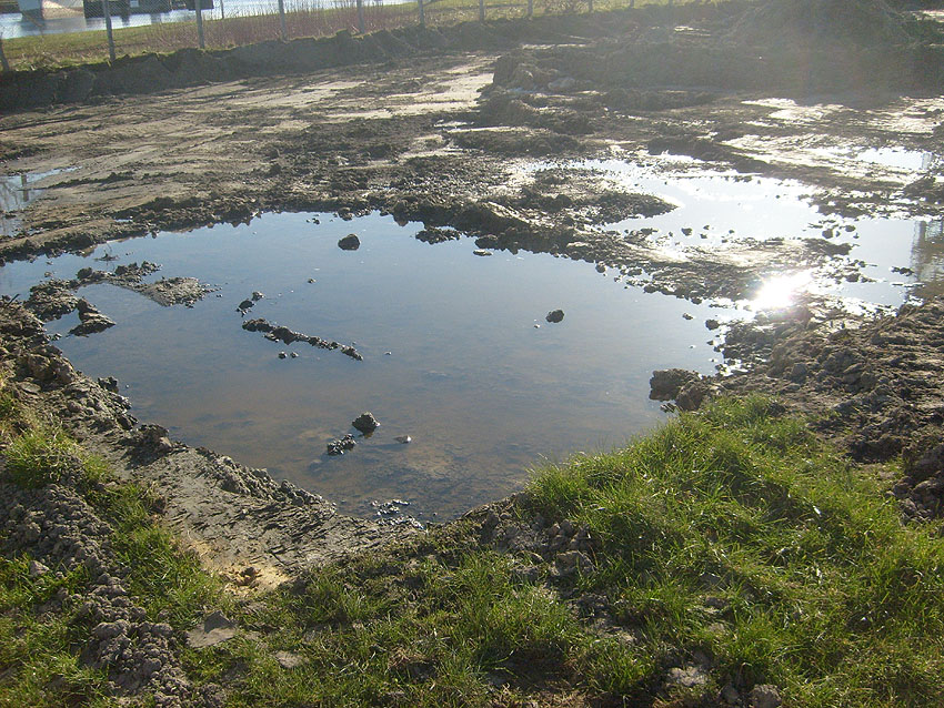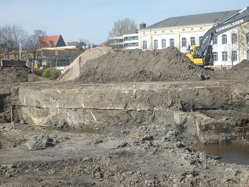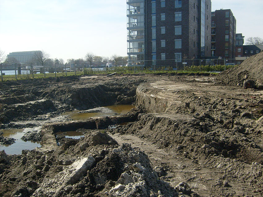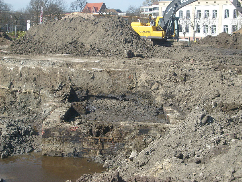 Die Arbeiten am Tankfundament schreiten weiter voran. Der Erdaushub südlich des Fundamentes wurde weiter vertieft. Immer mehr tut sich hier ein historischer Teil von Wilhelmshavens Unterwelt auf. Die Beseitigung des gewaltigen Fundamentes dürfte arbeitsreich werden. Das Wasser zeigt inzwischen Ölschlieren auf.