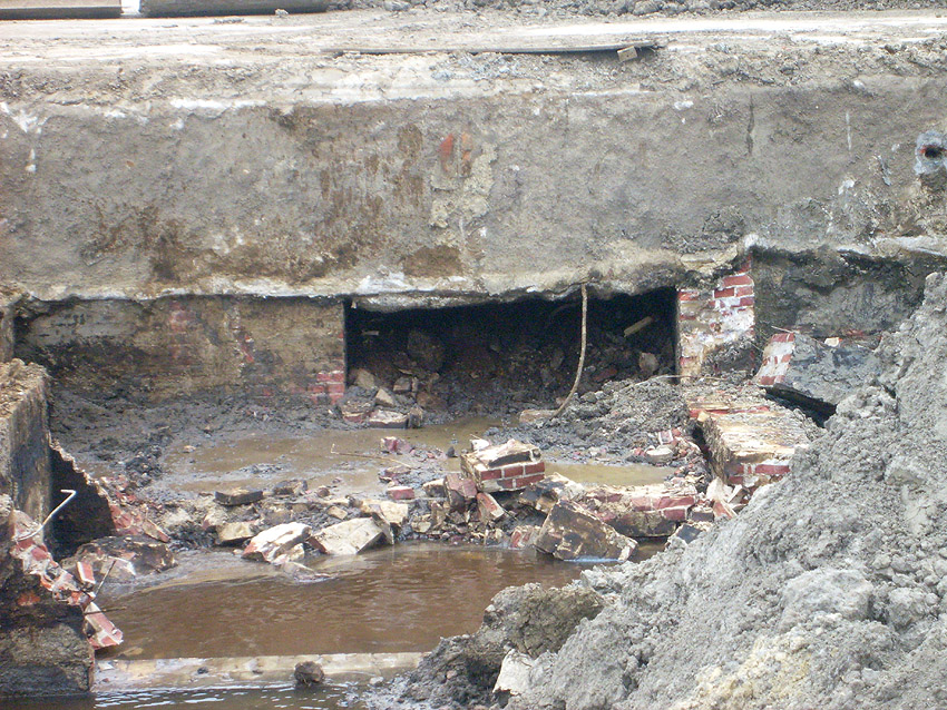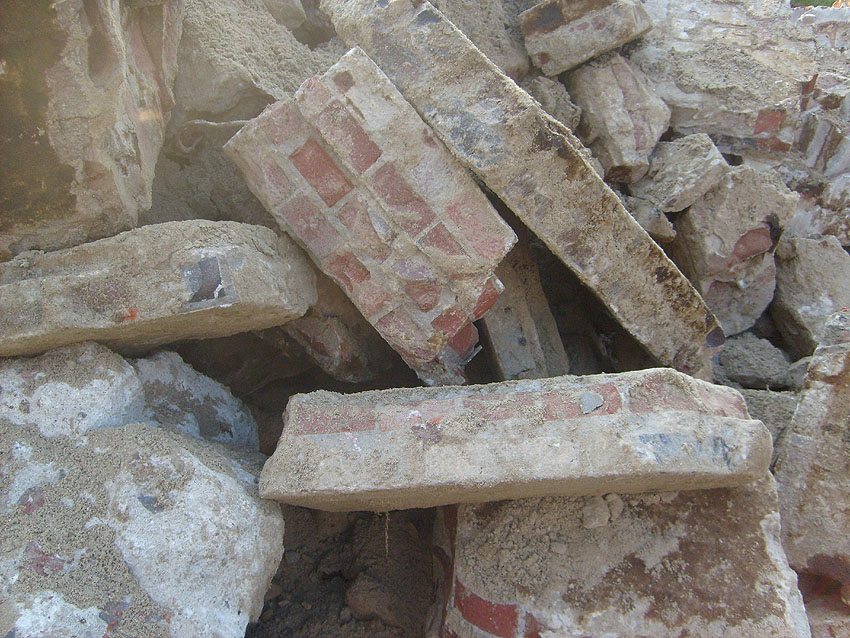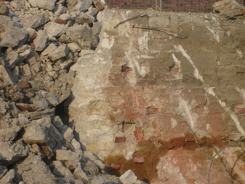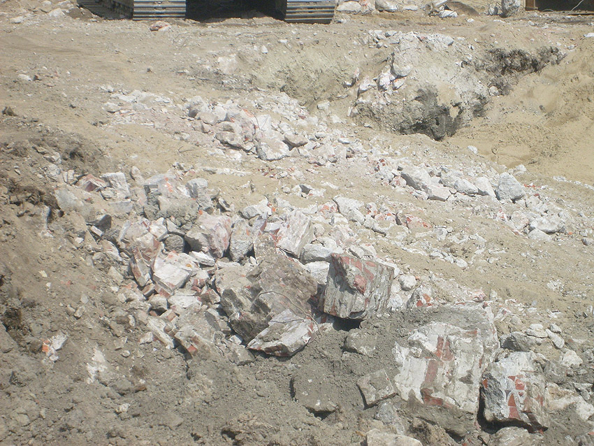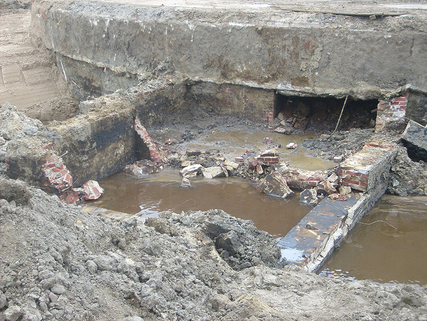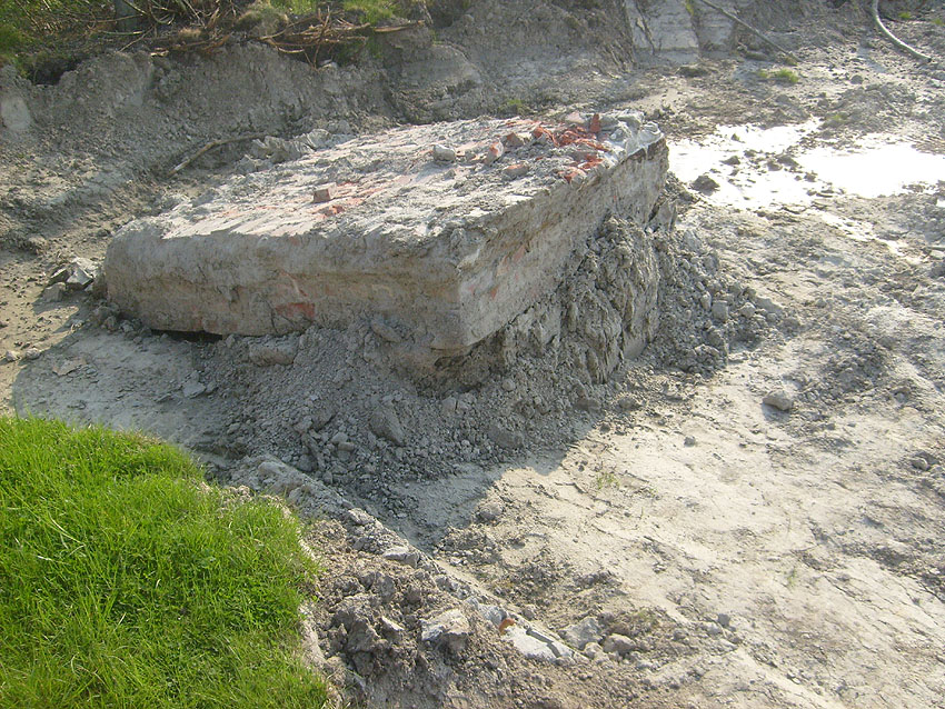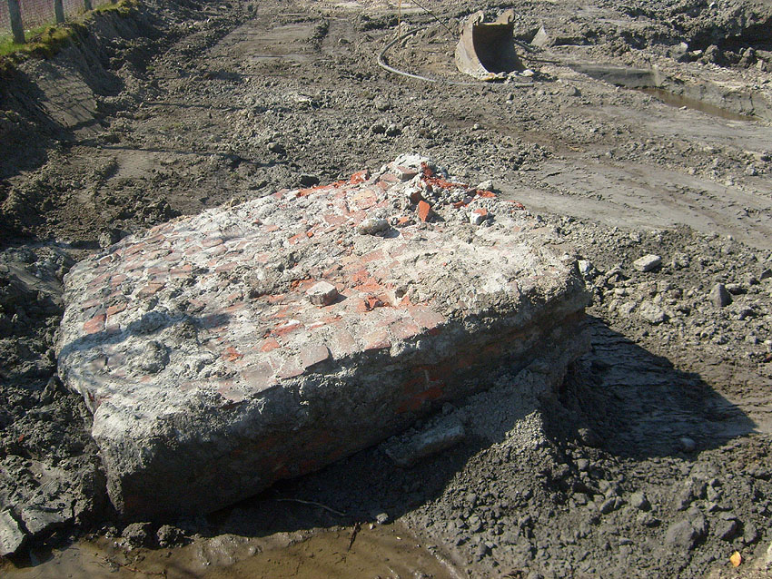 Weitere Abbrucharbeiten am Fundament. Teilweise ist bereits die untere Betonplatte des Ringfundamentes ersichtlich. Darunter wiederum schließen sich die Gründungsholzpfähle an.
