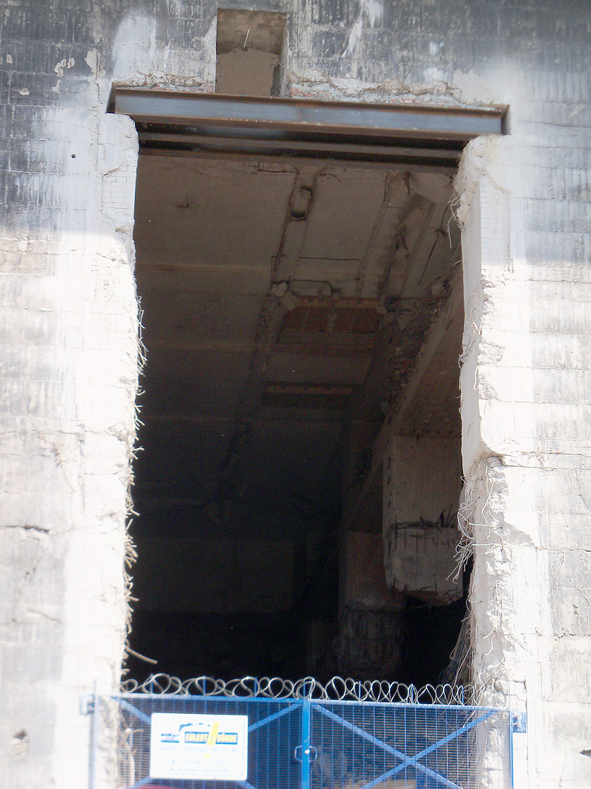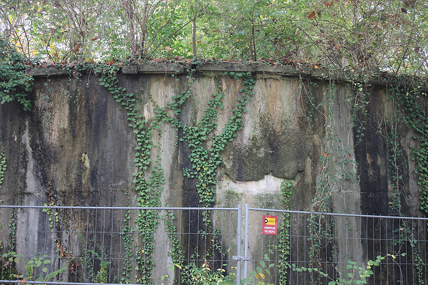 Ein anliegendes Gebäude, welches auf die Reste eines im Krieg teilzerbombten Wohnhauses errichtet wurde, ist vor einiger Zeit abgerissen worden. Zu sehen in der Abrissgrube noch Teile der massiven Kelleraußenwände. Eventuell befanden sich hier Luftschutzkeller.
