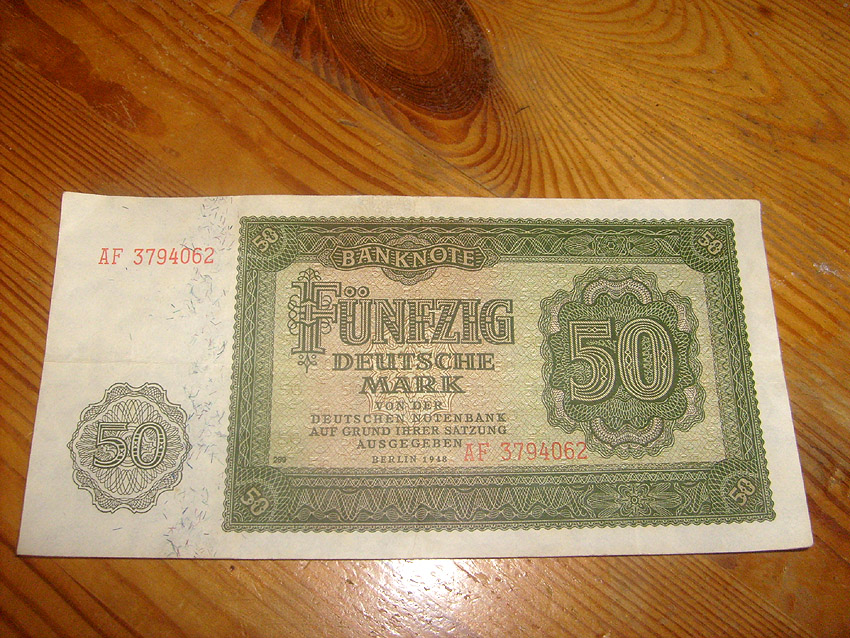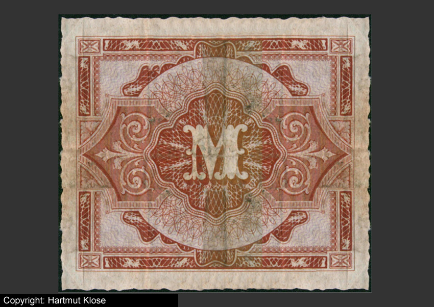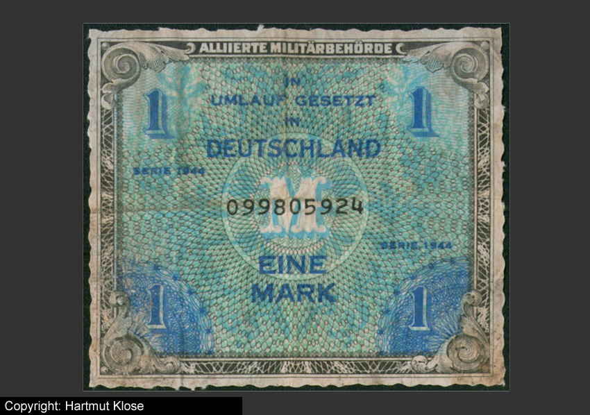 Eine-Mark-Schein der alliierten Militärbehörde: Der Schein wurde 1944 in Umlauf gebracht, zu einer Zeit als noch Krieg in Deutschland war. Die In-Umlaufbringung muss also irgendwo im Westen gewesen sein, wohl im Bereich Aachen, da dieses Gebiet bereits seit Oktober 1944 unter alliierter Kontrolle stand...