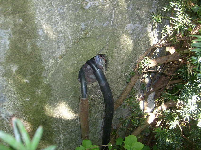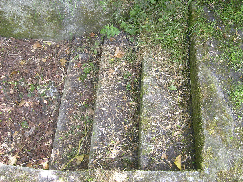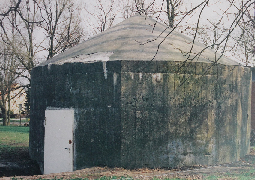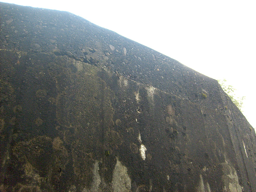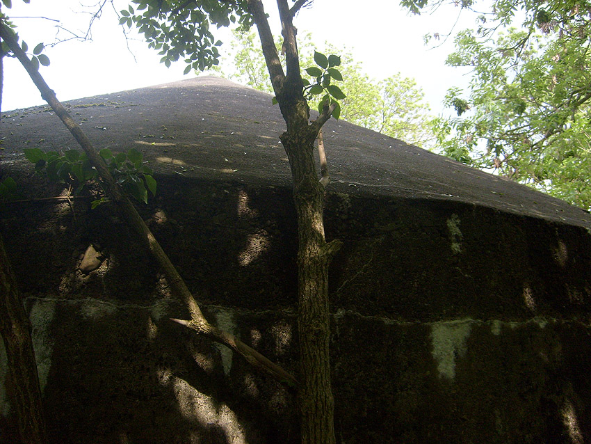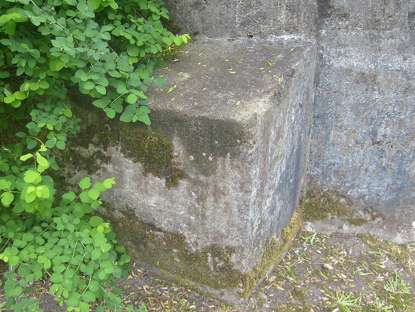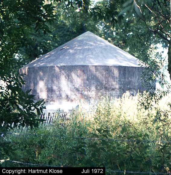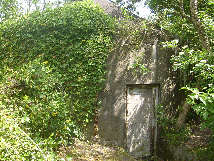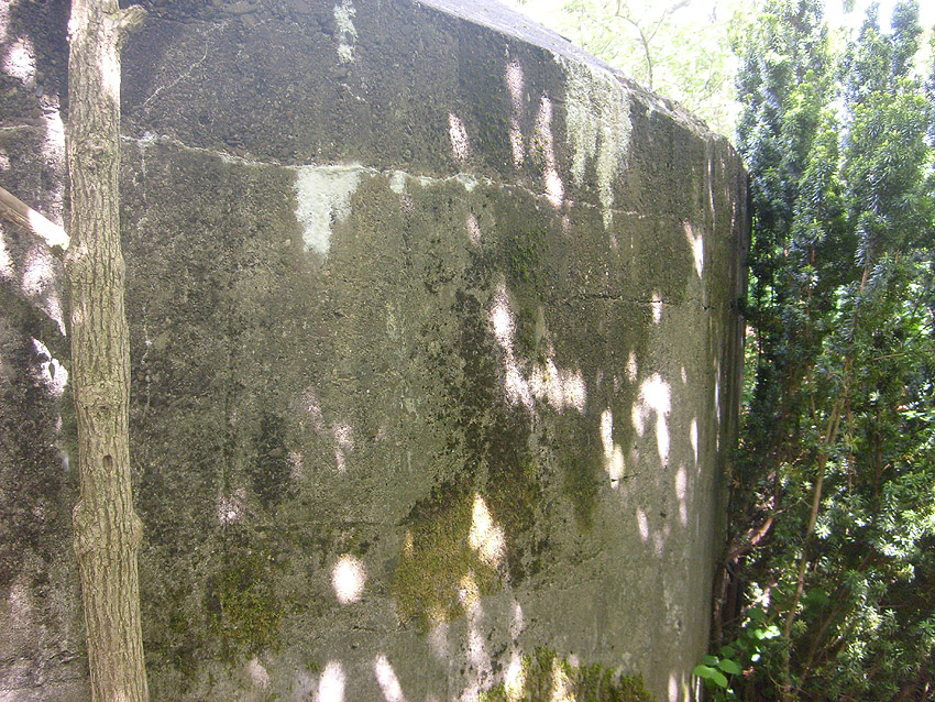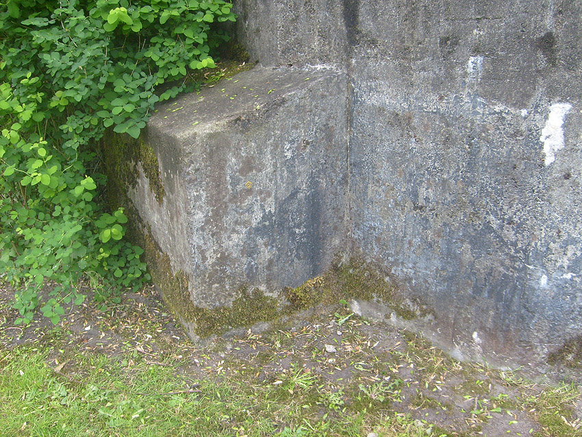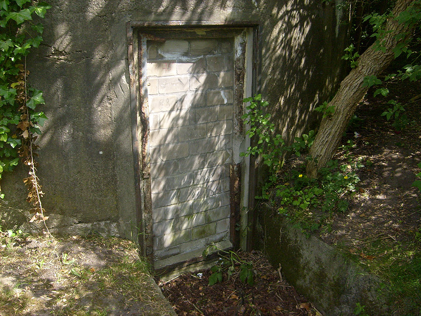 Der Betonblock im Notausstiegsbereich ist von allen Seiten verschlossen. Entweder wurde er nachträglich vor den Ausstieg gesetzt (unwahrscheinlich), oder ein, bzw. zwei seitliche Ausstiege wurden nach dem Krieg zugemauert und verputzt. Davon ist allerdings nichts mehr erkennbar... Ehemalige Öffnungen lassen sich höchstens erahnen. Oder befand sich im Block direkt vorne an der Längsseite eine Öffnung?