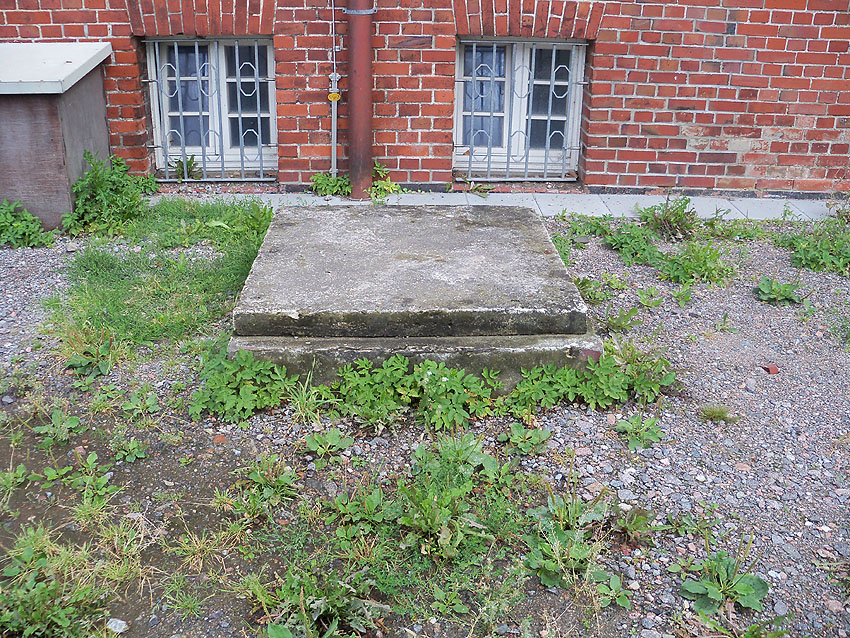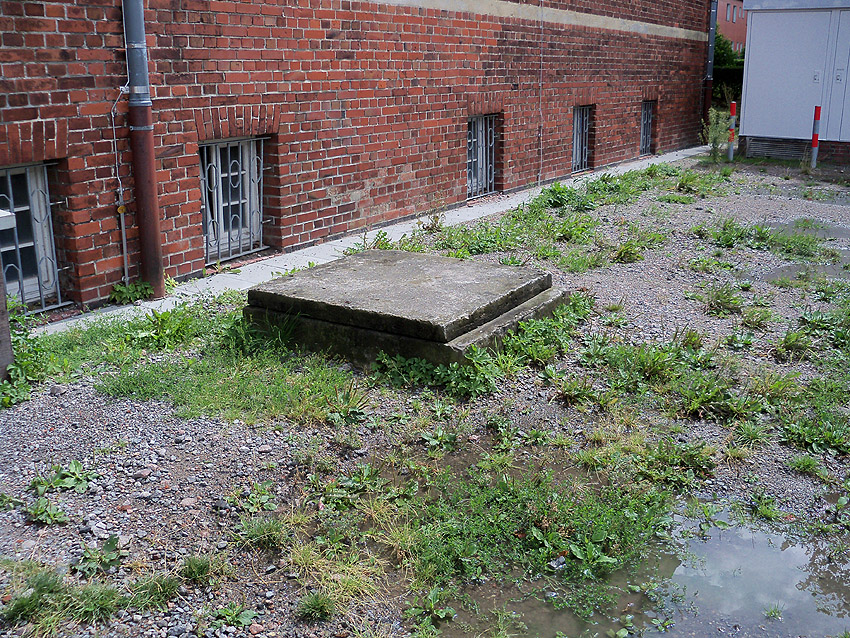 Nachtrag 2021: Bei einem Blick unter den zeitweilig etwas zur Seite geschobenen "Deckel" sind mehrere Steigeisen, die in dem darunter liegenden Schacht (wohl) an dessem gebäudeseitiger Wand entlang führen, zu sehen...