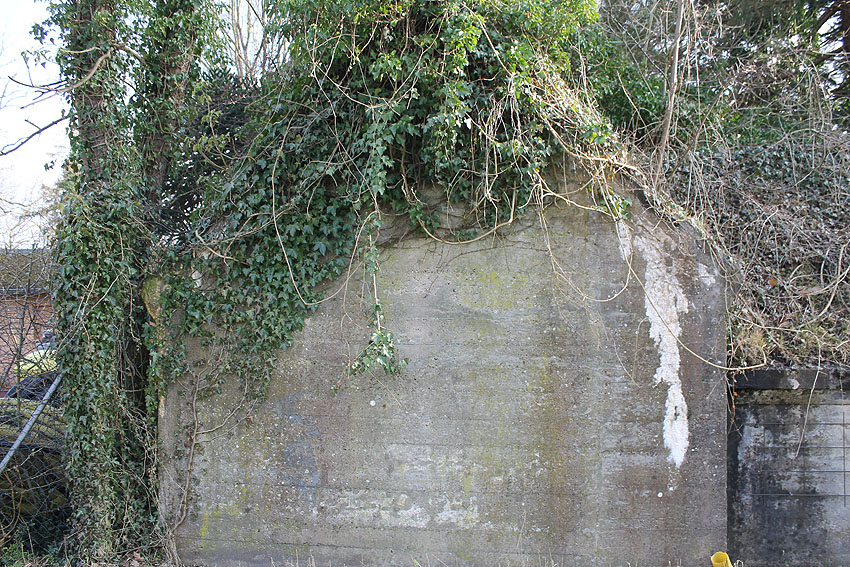 Dieser Deckungsgraben scheint aus zwei Bauelementen zu bestehen. Hier zu sehen ist die Trennungskante. Vielleicht hat diese Tatsache etwas mit den Erschütterungen bei Nahtreffern und der Länge des Bauwerkes zu tun. Hierdurch könnten Brüche im Beton als Pufferzone vermieden worden sein. Theoretisch müssten dann alle betonierten Deckungsgräben der Stadt diese Trennungsstellen aufweisen.