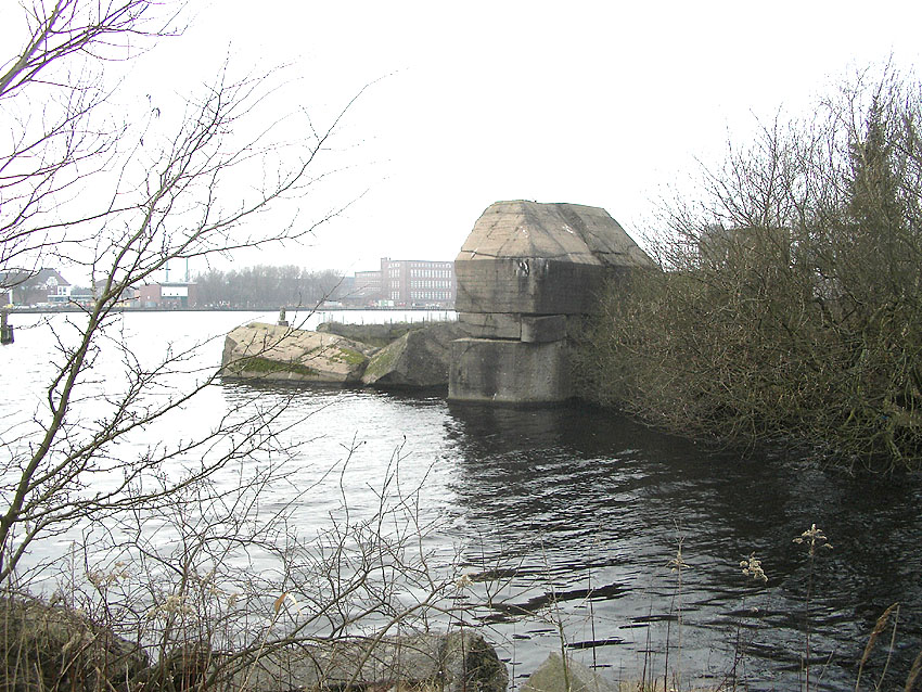 Blick vom gesprengten verbunkerten Dock auf die LS-Turmkuppel Ostkaje...