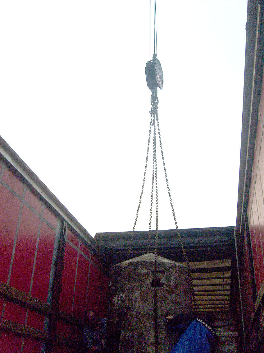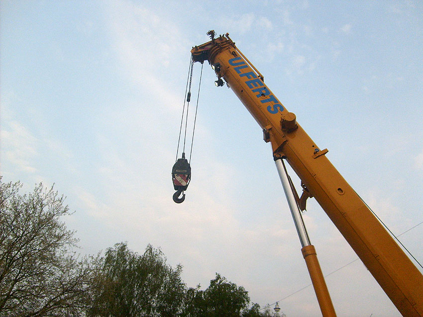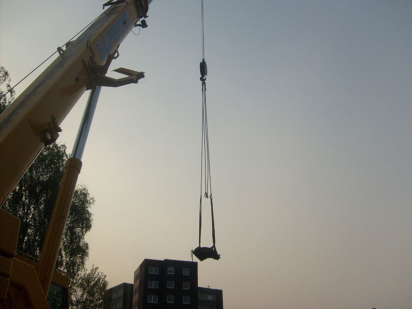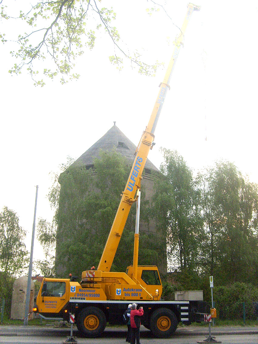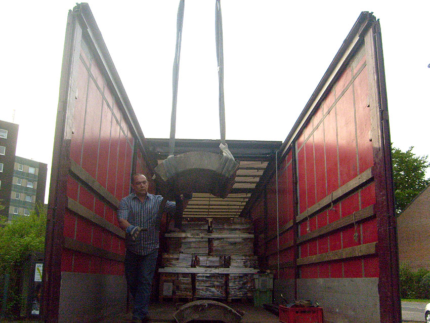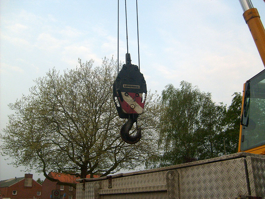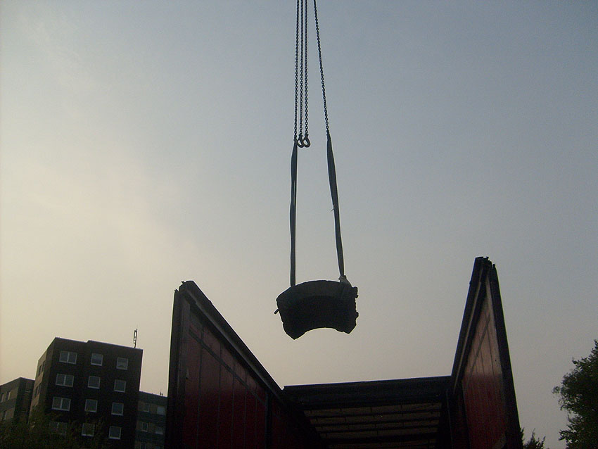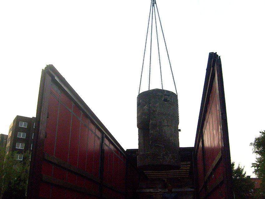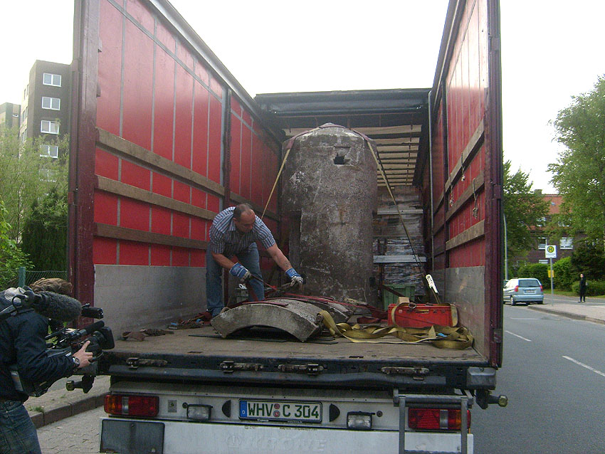 29.04.11: Nachdem die Splitterschutzzelle bereits gestern Abend in Wilhelmshaven angekommen war und auf dem Fuhrplatz der Spedition mitsamt LKW abgestellt wurde, erfolgte nun heute am frühen Morgen pünktlich um 7 Uhr die Ankunft an der Norderneystraße / Minsener Oog 1A. Ohne jede Reibung wurde die 3,5 Tonnen-Zelle mitsamt beider Stahlbetontüren innerhalb von circa 30 Minuten abgeladen und am neuen Standort aufgestellt.