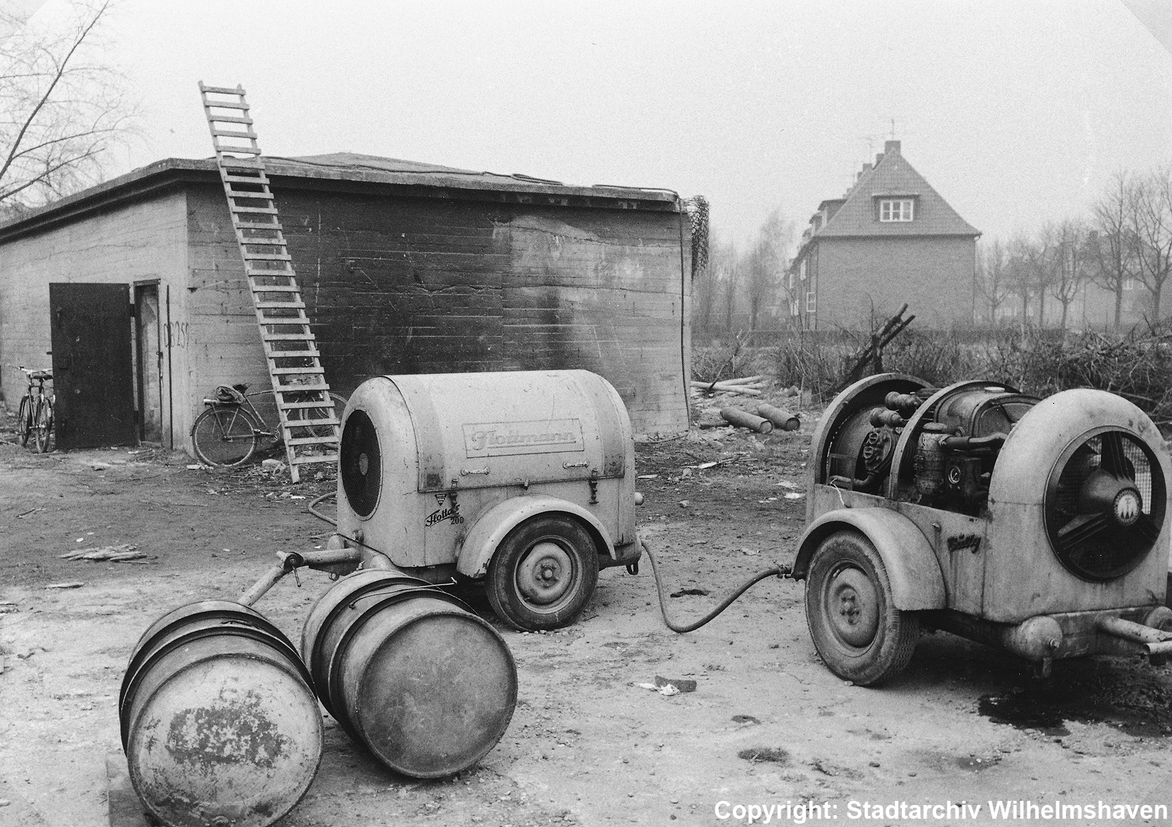 Hier zu sehen der kleine Hochbunker Bremer Straße / Hamburger Straße kurz vor seinem Abbruch. Im Hintergrund vorm ersichtlichen Gebäude war der Feuerlöschteich. Der LS-Turm Hamburger Straße befindet sich gerade außerhalb des Bildbereiches rechts.