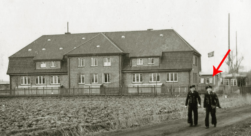 Bild von 1942 / höchstwahrscheinlich Frühjahr. Noch keine Splitterschutzvorbauten an der Südseite des Gebäudes. Auch noch keine beiden Rundbunker nördlich. Diese wurden im Jahre 1943 errichtet. Die massive Baracke hinten mit LS-Klappen an den Fenstern ist gerade vollendet.