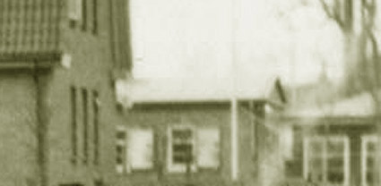 Dieses Bild von 1943 zeigt Splitterschutzvorbauten der Notausstiege und äußeren Eingänge am Gebäude der Funkpeilstation für den dahinter liegenden LS-Keller im Halbkellergeschoss. Nach Hinweisen bestanden diese - massiv - aus Mauerwerk, Hartholz und Beton. Die Vorbauten wurden bald nach dem Krieg wieder abgebrochen. Am Gebäude im Hintergrund zu sehen LS-Klappen an den Fenstern (Pfeil). Das Nebengebäude wurde Anfang 1942 als äußerst massive Verwaltungsbaracke als Erweiterung des Hauptgebäudes errichtet. Zudem existierten auf dem Gelände weitere Baracken. Das ersichtliche Bauwerk existiert noch heute und beherbergt ein Schuhhaus.