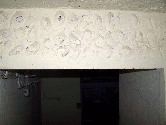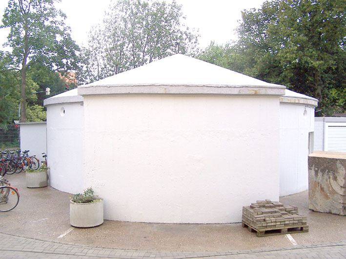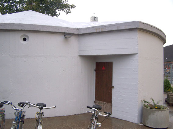Bemerkenswert ist, dass dieser massive Rundbunker über eine kreisrunde, umlaufende Zerschellerplatte verfügt, ähnlich wie jene der großen runden Luftschutztürme Wilhelmshavens...