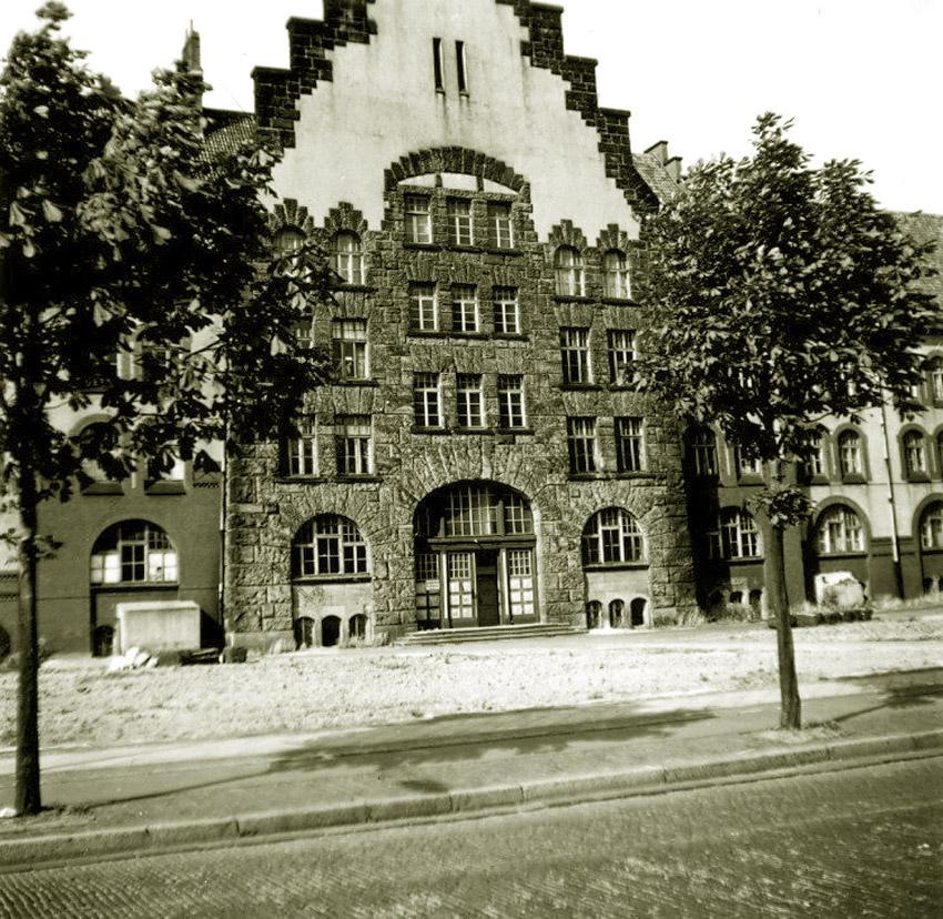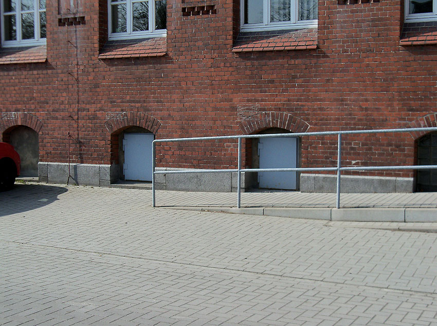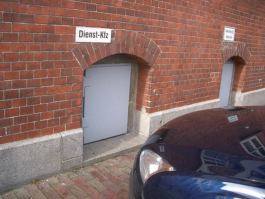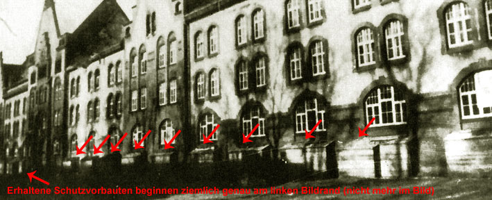 Hier zu sehen die Südfront der Torpedokaserne / Roonkaserne. Ursprünglich war fast die gesamte südliche Stirnseite der Torpedokaserne / Roonkaserne / Stadtkaserne (1941 großteilig zerbombt), Bismarckkaserne und Moltkekaserne mit Verbunkerungen der Kellerfenster versehen. Auch die II. Torpedokaserne besaß verbunkerte Eingänge. Diese sind auf unseren Seiten gesondert aufgeführt.