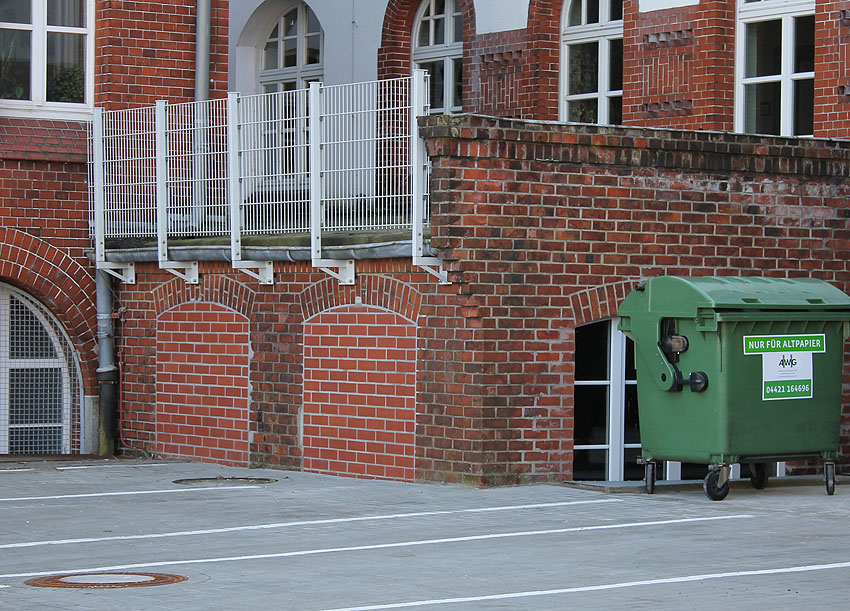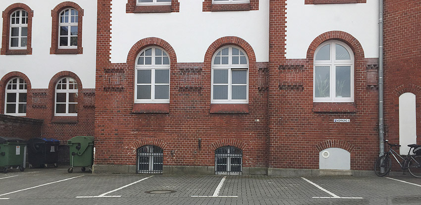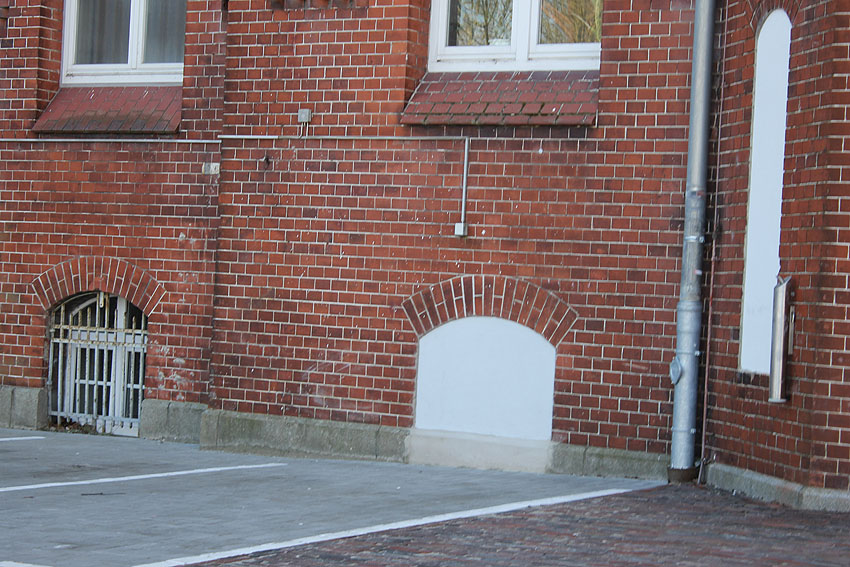 Im Hof an der Nordseite des Gebäudes sind noch immer gemauerte Versiegelungen von Kellerfenstern vorhanden. Diese wurden während der Renovierung der Anlage aufgrund des Denkmalschutzes nicht verändert, lediglich sandgestrahlt, die Fugen teilweise neu verputzt und wie unten ersichtlich mit Lufteinlässen versehen. Hier hinter waren LS-Kellerbereiche. An den Gebäuden der ehemaligen Kaserne Mühlenweg beispielsweise sind auch noch solche Vermauerungen der Kellerfenster vorhanden. Diese wurden beim Neubau des NGW in dem Bereich ebenfalls belassen.