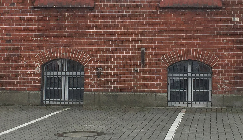 Im Hof der ehemaligen Roonkaserne sind noch weitere Objekte dieser Art zu sehen. Vermauerte Kellerfenster und eine Klappe an der Ostseite des Hofes: