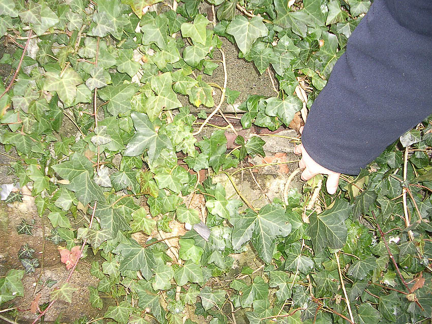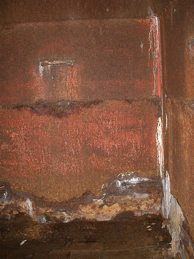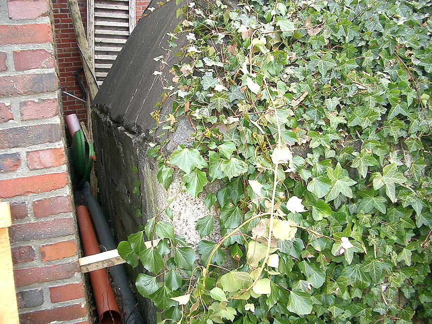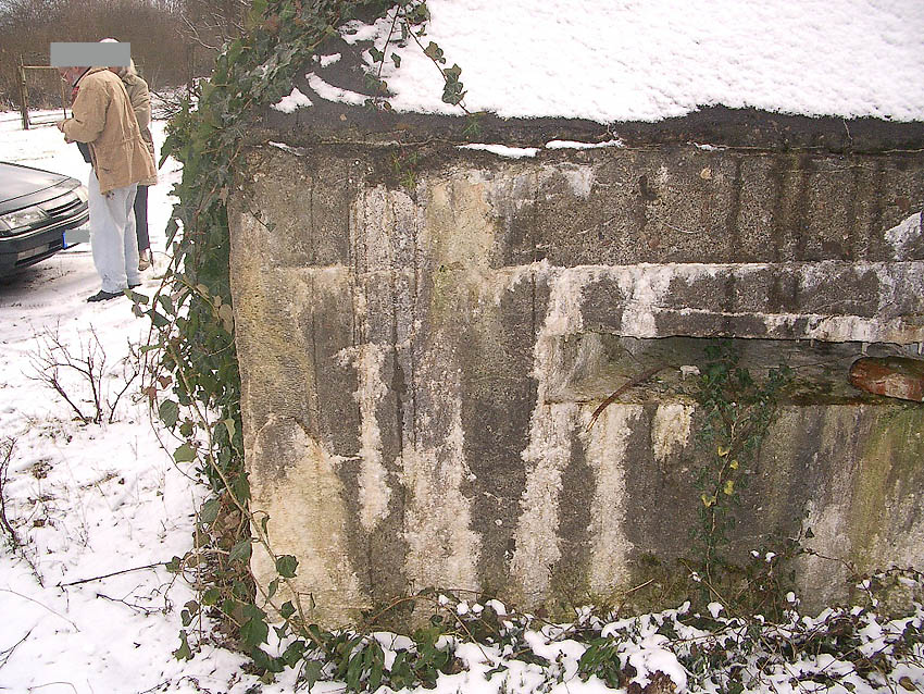 Dieser Umstand erklärt die vorhandene nun "blinde" und nachträglich vermauerte und verputzte Sichtscharte an der Ostseite des Bunkers. Unten vor den Rohren leicht zu sehen ist der Bereich der Scharte, welche nun gegen das nach dem Krieg neu errichtete Anbaugebäude "sehen" würde...