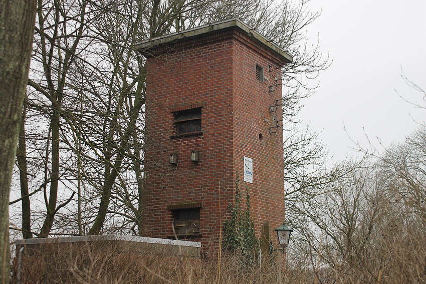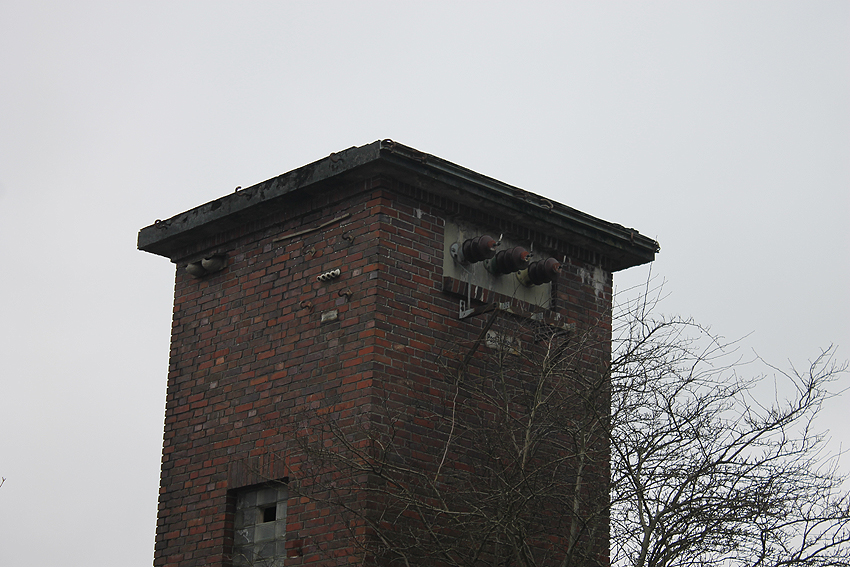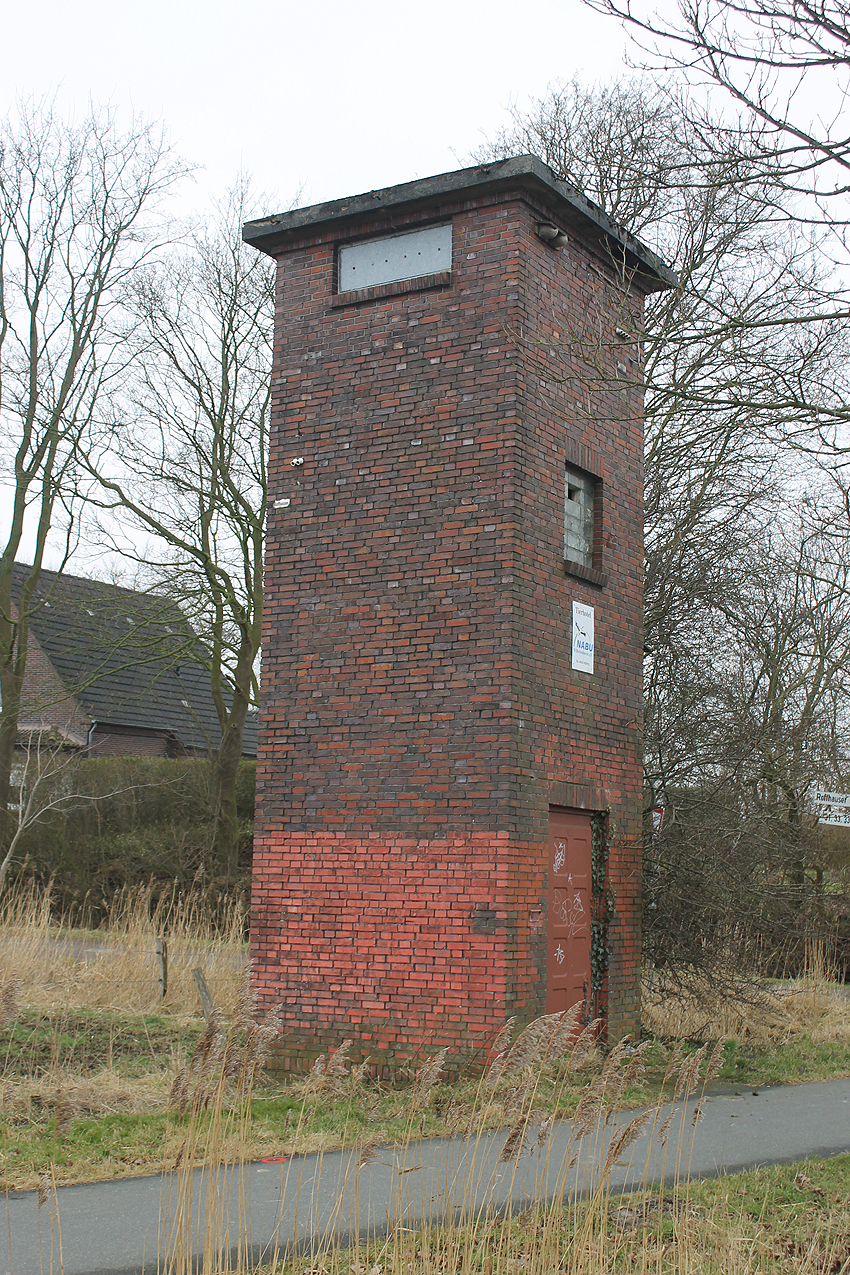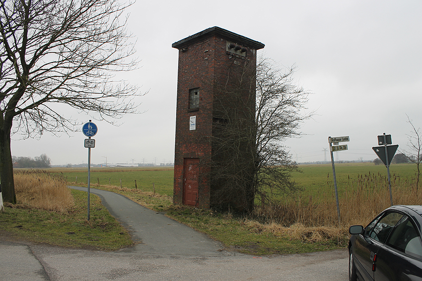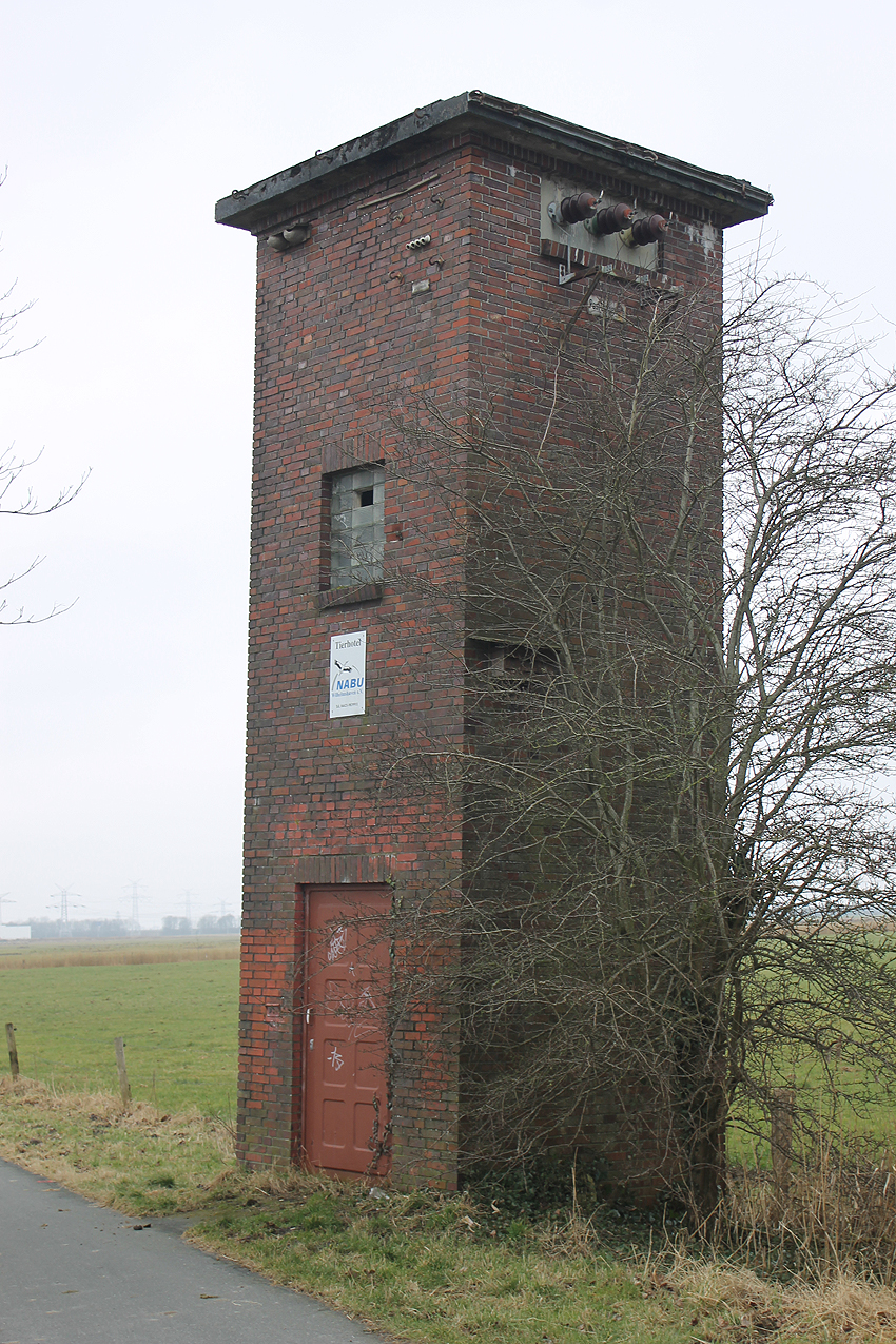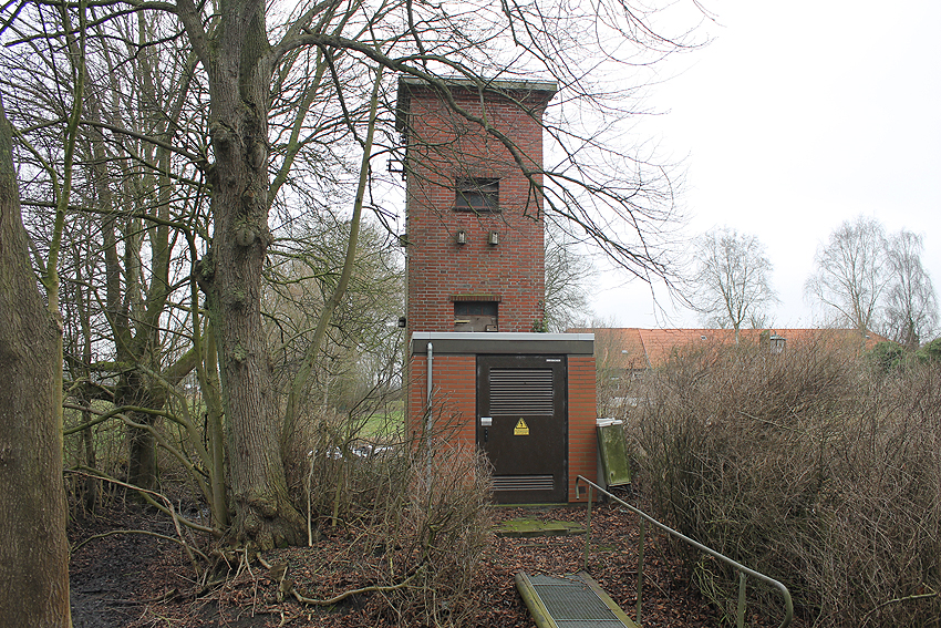 Trafoturm unweit des Gebäudes Antonslust. Ein weiterer Turm befindet sich etwas weiter westlich an der ehemaligen Marine-Nachrichtenstelle Langewerth und ein dritter Turm noch weiter westlich in Richtung Roffhausen. Von dort wird die Leitung nach Norden in Richtung Marine-Nachrichtenstelle Accum abgezweigt sein. Verbund zur schweren Flakstellung Schaar wird ebenfalls bestanden haben.