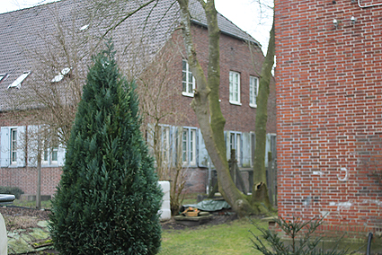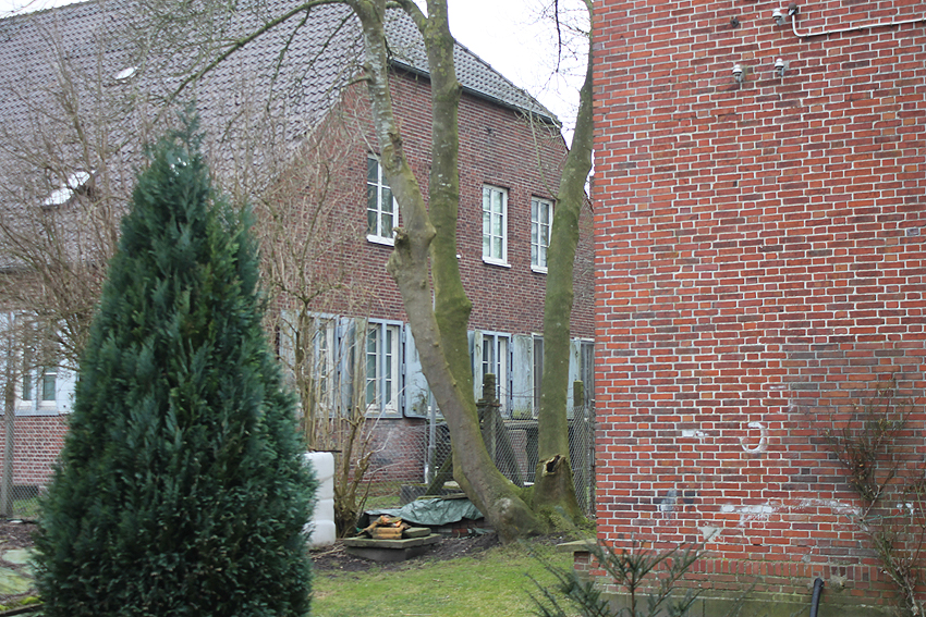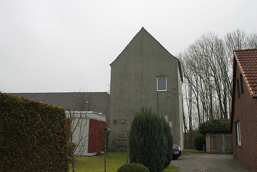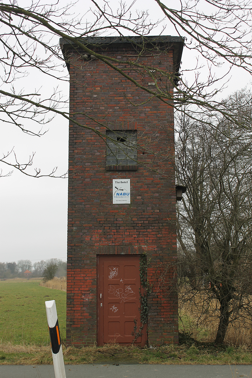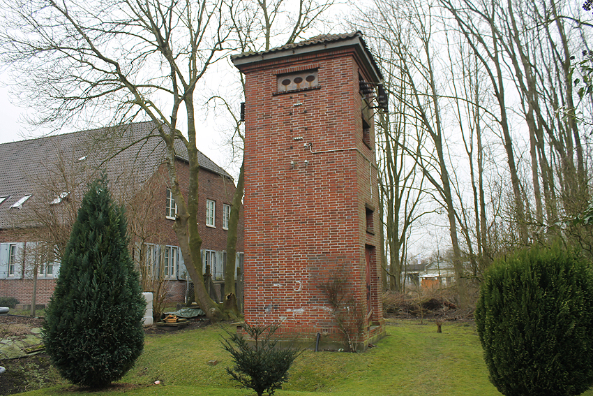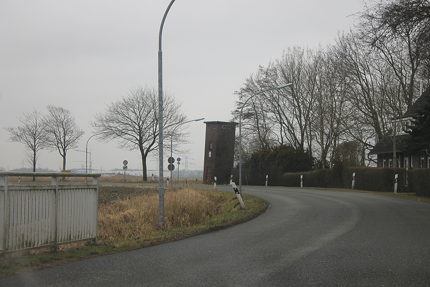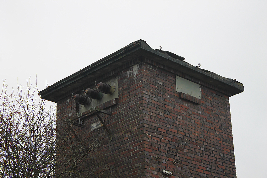 Trafoturm unweit des Gebäudes Antonslust. Ein weiterer Turm befindet sich etwas weiter westlich an der ehemaligen Marine-Nachrichtenstelle Langewerth und ein dritter Turm noch weiter westlich in Richtung Roffhausen. Von dort wird die Leitung nach Norden in Richtung Marine-Nachrichtenstelle Accum abgezweigt sein. Verbund zur schweren Flakstellung Schaar wird ebenfalls bestanden haben.
