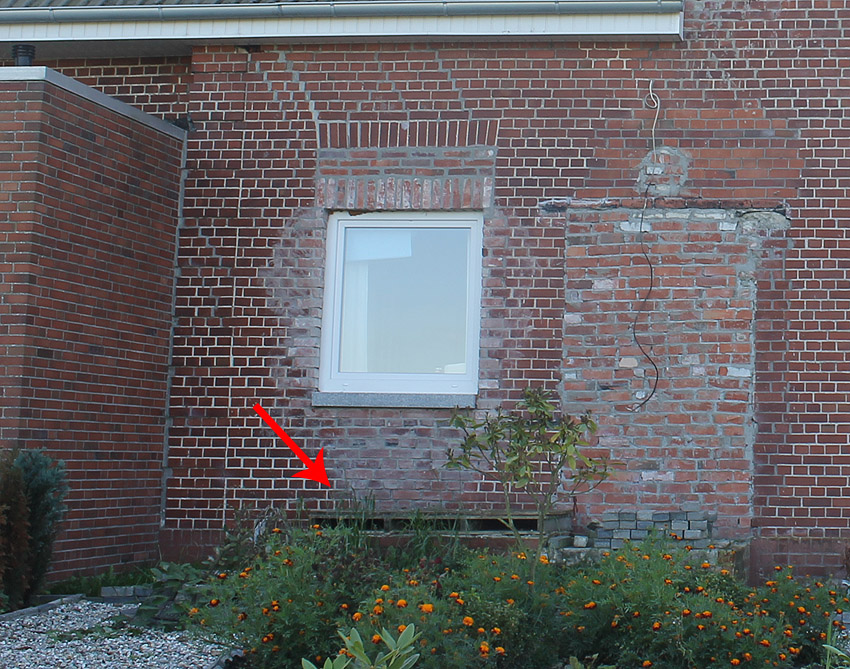 Stand Oktober 2015: Bereits Anfang 2015 wurde aufgrund der Sanierung des Gebäudes der splittergeschützte Eingangsbau beseitigt. Nur noch im Sockelbereich ist der Abstieg ansatzweise erkennbar. Über dem Abstieg liegt eine Holzpalette.