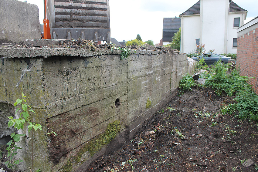 Nachtrag Mai 2020: Dies ist die untere Hälfte vom Eingangsbau des Deckungsgrabens Am Tief / Verbindungsstraße. Der Oberbereich wurde nach dem Krieg entfernt. Der Graben wurde Ende April bis Anfang Mai 2020 über Erdgleiche abgerissen. Interessant: Die nahe Anlage Lindenstraße besteht lediglich im ersten Grabenabschnitt. Der hintere abgeknickte "L-Bereich" wurde für die nachkriegszeitige rückwärtige Erweiterung des anliegenden Wohnhauses beseitigt. Auch der Eingangsvorbau wurde entfernt (für eine Garageneinfahrt). Die Anlagen gehören einer Serie mit zwei Deckungsgräben in Heidmühle und einem in Moorwarfen an. Eine "verdoppelte" Version in Zickzackform existiert noch heute in Middelsfähr, eine weitere Anlage gab es in Sande.