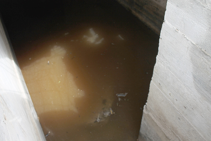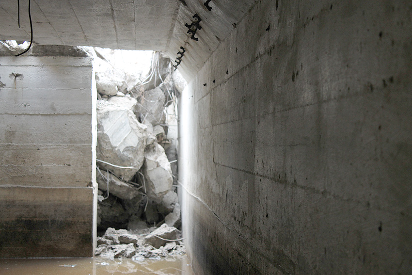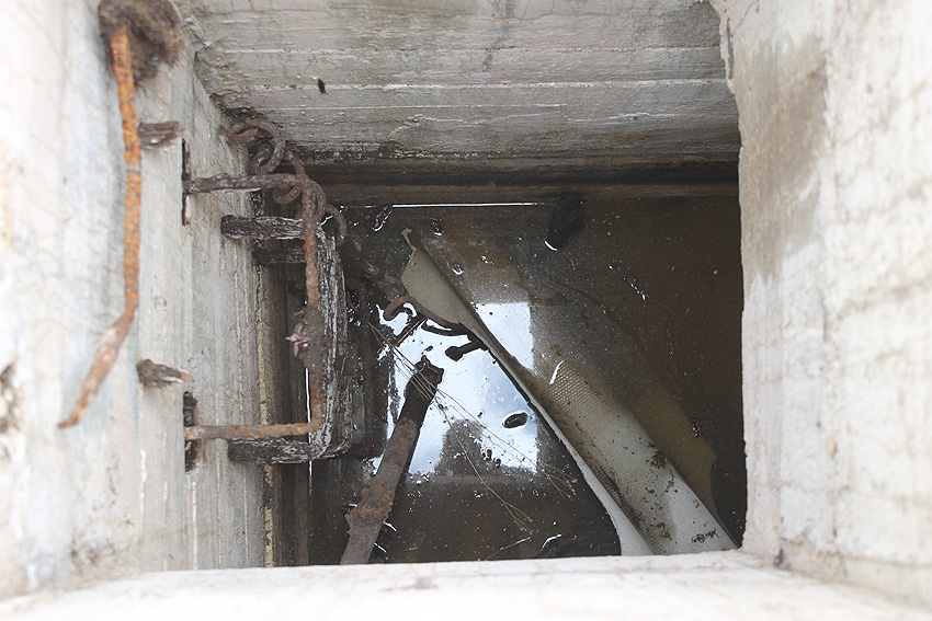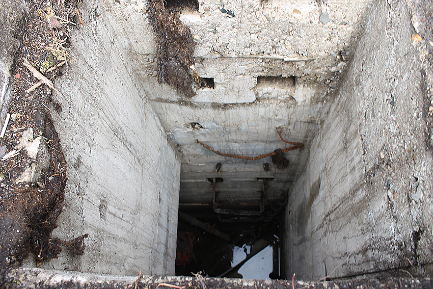 Die Öffnung am Grabenende in der Wand scheint älter zu sein. Eventuell wurde sie bereits während der Fertigung eingebracht. Zweck unbekannt. Die hellen Bereiche an deren Kante sind Absinterungen. Im Innenbereich der Öffnung wurde nachträglich angeputzt (helle Strukturen). Es könnte auch sein, dass die Öffnung nach dem Krieg als "Pumpen-Zugang" geschaffen wurde und der Graben gewisse Zeit als Zisterne diente.