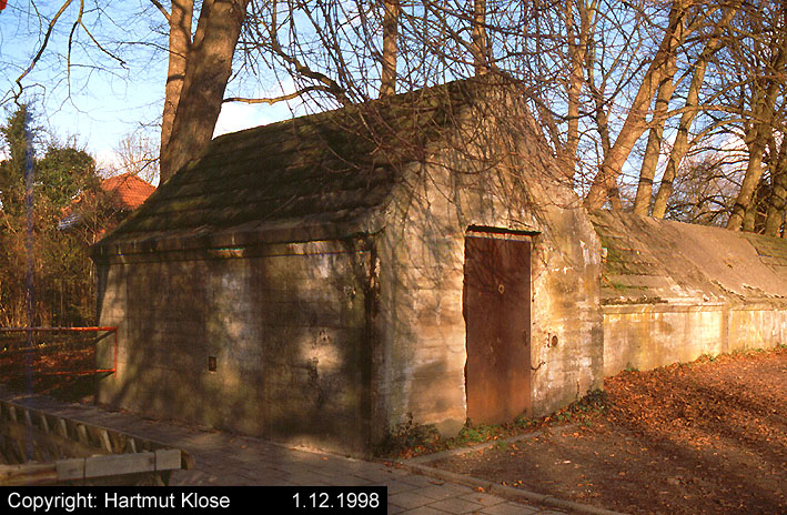 Im Juni 2013 sieht das Gelände der ehemaligen Schule Neuende wie folgt aus. Der anliegende betonierte Deckungsgraben ist glücklicherweise noch immer unversehrt geblieben. Bis auf die Einbringung einer neuen Türöffnung im Nordbereich des mittleren Eingangsbauwerkes soll hier nach unseren Informationen glücklicherweise zukünftig auch nichts weiter geschehen...