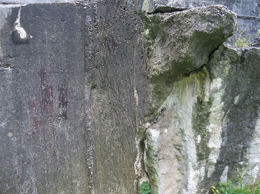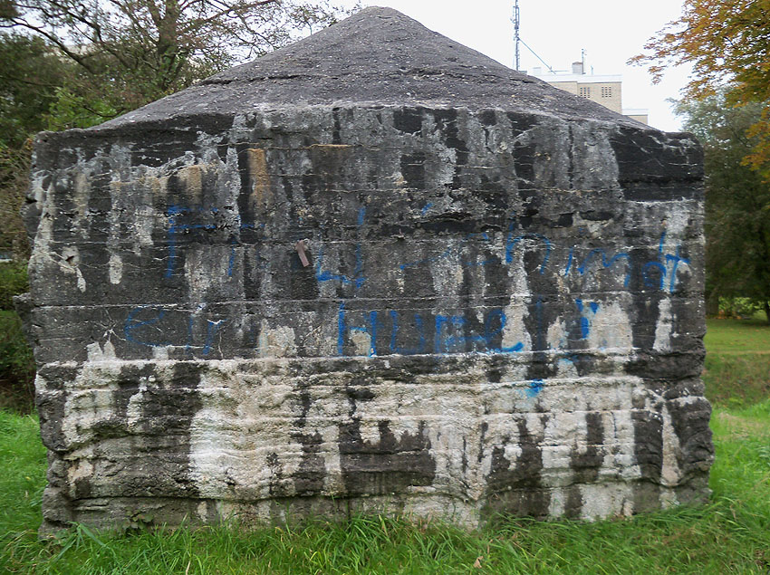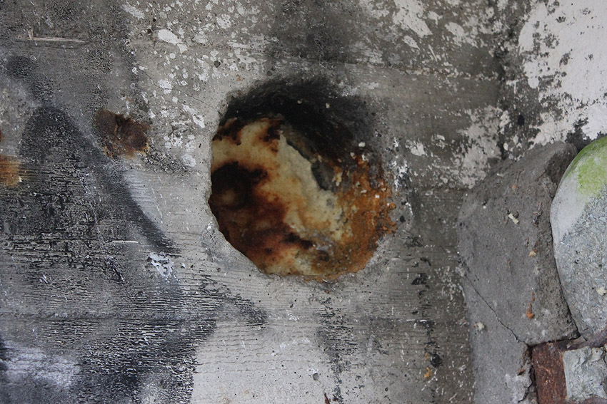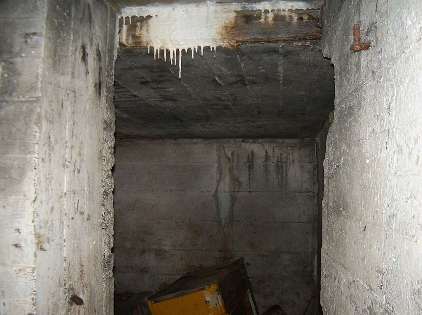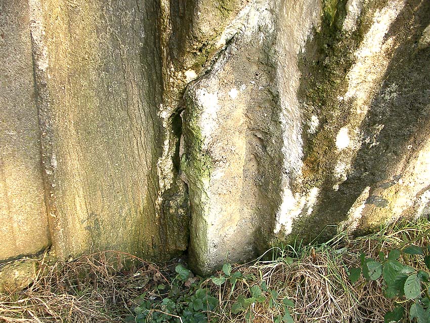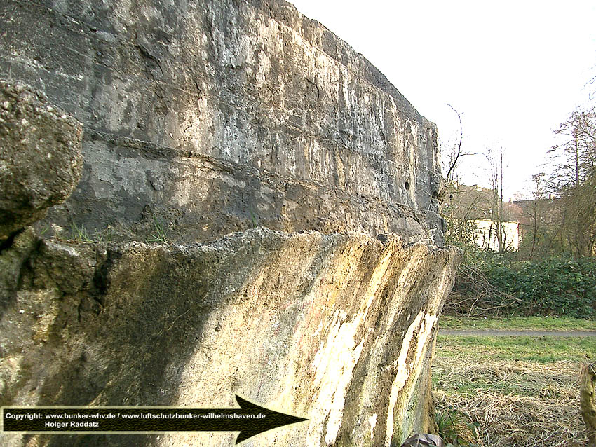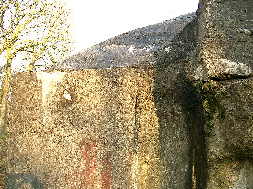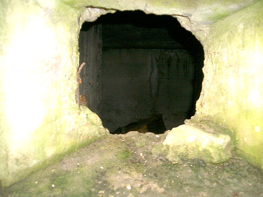 Hier war ein mutmaßlich verbunkerter Anbau in Röhrenbauform angesetzt. Links zu sehen ein runde Aussparung am Bunker in vertikaler Richtung. Dort könnte ursprünglich eine Art Rohr positioniert gewesen sein...