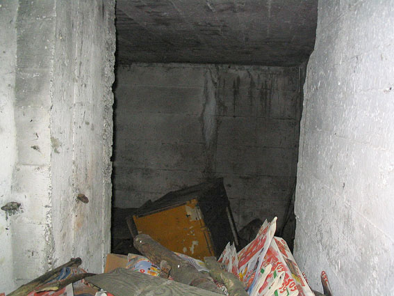 Blick durch die Gasschleuse, dahinter der Hauptraum mit Jahrzehnte altem Unrat. Rechts sind die Scharniere der inneren Schutztür zu sehen...