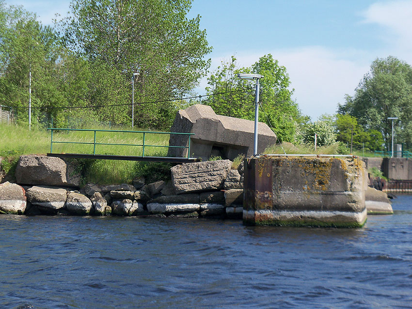 Allerdings ist kein Hohlraum zu erkennen, bzw. es ist unklar, in welcher Position das Objekt ursprünglich stand / lag. Auch relevante Abbruchbereiche aufgrund der damaligen Sprengung bezüglich eines ehemaligen Verbundes mit weiteren Teilbereichen sind hier nicht erkennbar. Ein weiterer, an der Wasserkante liegender größerer Trümmer direkt daneben dürfte aber zum Objekt gehören. Auf Luftbildern von 1945 ist leider nichts erkennbar.