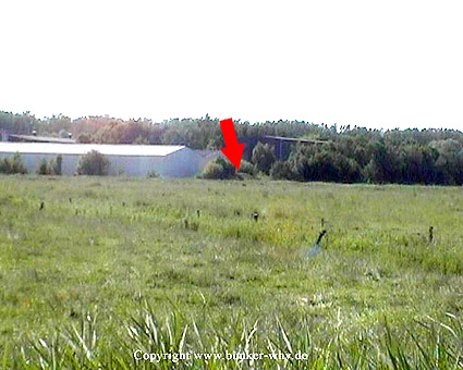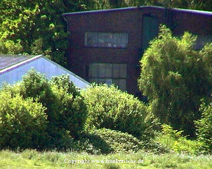 Erkennbar sind die Beobachtungsöffnungen im Bunker. Sie werden wohl ursprünglich mit Stahklappen (von innen?) versehen gewesen sein. Es handelt sich bei diesem Bunker um eine Sonderbauform. Interessant sind die Deckengestaltung und die hervorgesetzten Wandbereiche zwischen den Öffnungen. Die Tür ist auf dem Bild augenscheinlich nicht erkennbar.