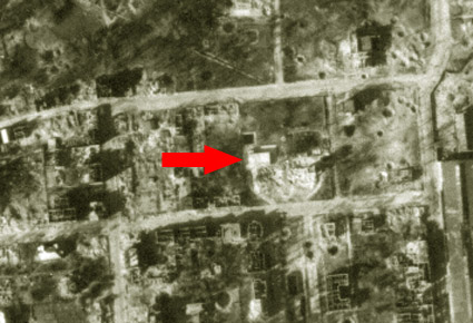 Zu erkennen sind zwei splittergeschützte Eingänge am Bunker, in ähnlicher Anordnung wie beim Bunker Schellingstraße. Eindeutig zu erkennen ist auch die Zerschellerplatte. Darüber zu sehen ein mutmaßlicher quadratischer Feuerlöschteich.