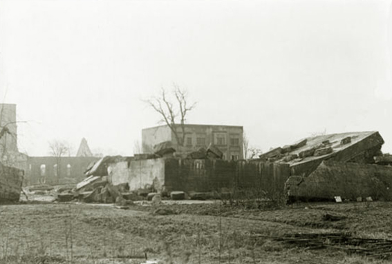 Im Hintergrund links die zerstörte Christuskirche an der Adalbertstraße / Peterstraße.