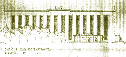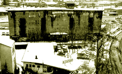 Der entfestigte sechsgeschossige (inklusive 1 Kellergeschoss) Hochbunker an der Rosenstraße / Moslestraße in den 1970er Jahren. Interessant sind die Wasserabläufe an den Dachkanten, wie sie auch beim Truppenmannschaftsbunker 750 zu finden sind.