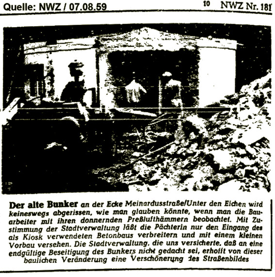 An den bald nach dem Krieg entfestigten und 1959 am Haupteingang entkernten Rundschutzbau (siehe altes Foto oben) wurde - nachdem er selbst ab etwa 1948 als Behelfskiosk genutzt worden war - zunächst ein kleiner Vorbau (1959, dafür die ersichtliche Umgestaltung des Haupteinganges des Bunkers) gesetzt, dann später ein kleines Kioskgebäude gebaut, wofür er als Lager diente (wohl aber schon eher, frühestens bereits ab 1959). Im September 1998 wurde das Gebäude samt Rundschutzbau entfernt. Auf das Fundament des Schutzbaues wurde bis Jahresbeginn 1999 der ersichtliche moderne Kiosk errichtet.