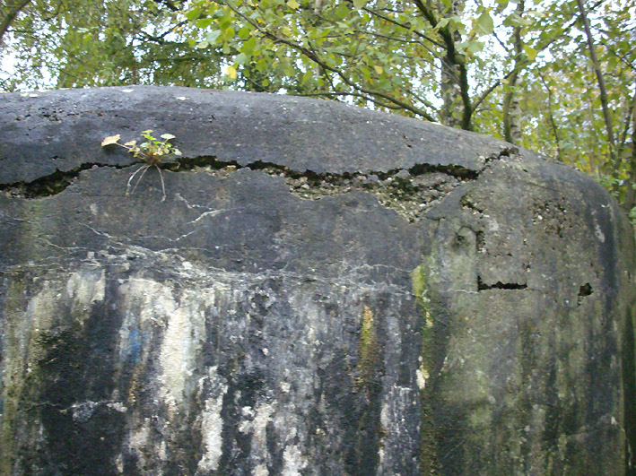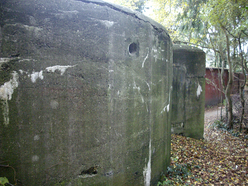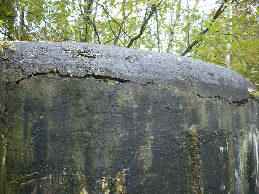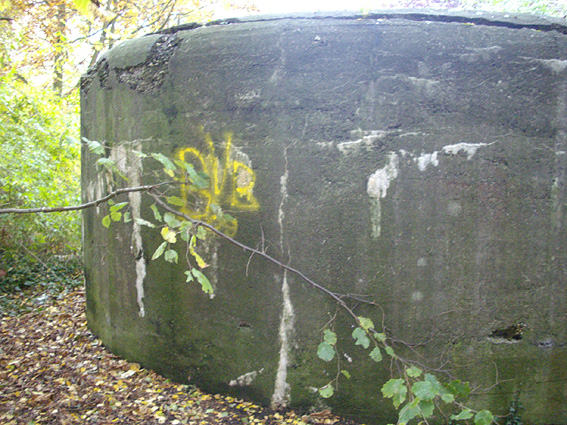 Anfang 2016: Der Rundschutzbau wurde mittlerweile komplett freigelegt, hell angemalt und als Lagerraum umgenutzt. Am Bunkerkörper ist im Südostbereich an der Wand eine kleine teilweise zerstörte Stelle zu erkennen.