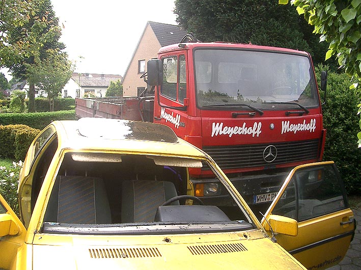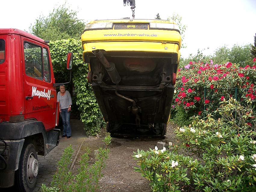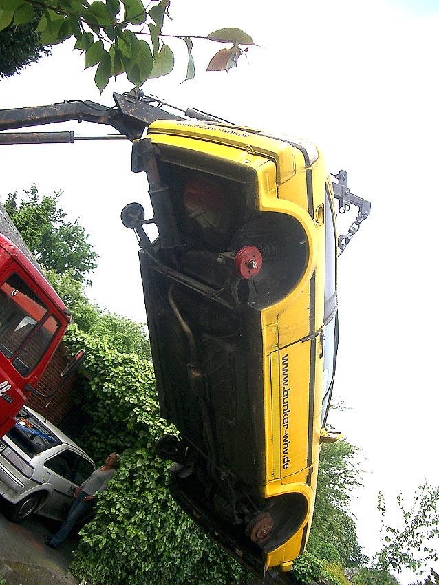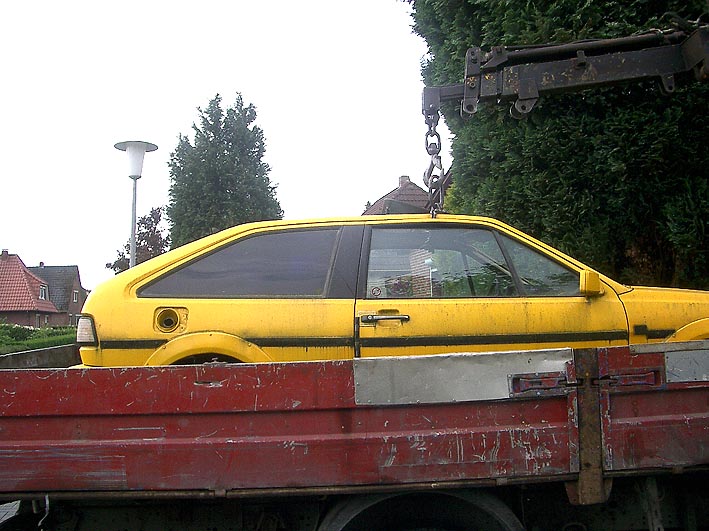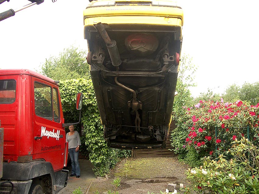 Hier die Aufnahmen des Abtransportes. Bald wird der Wagen auf dem neuen Standort / Autoverwertungsplatz vollkommen ausgeschlachtet sein und seine Reste werden später eingeschmolzen. So ist der Lauf der Dinge...