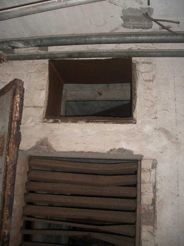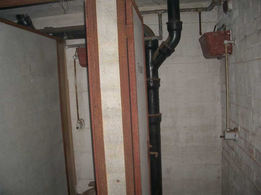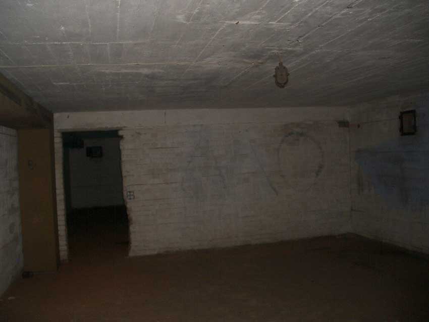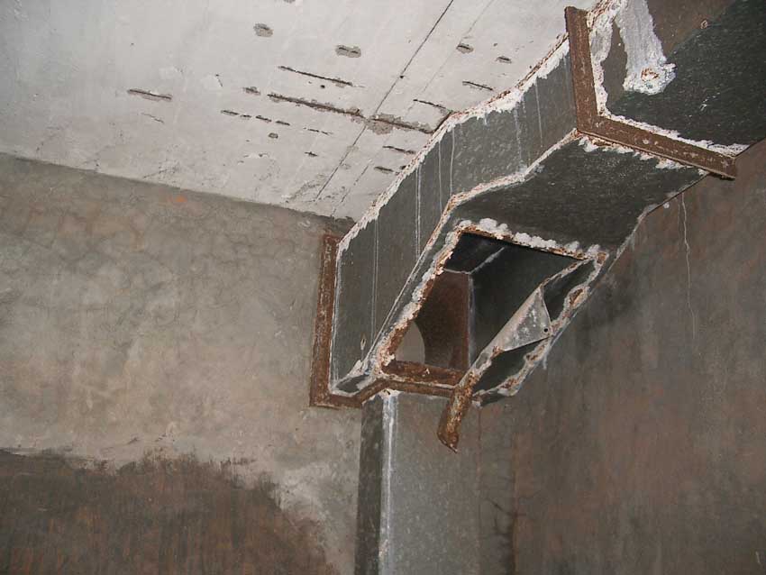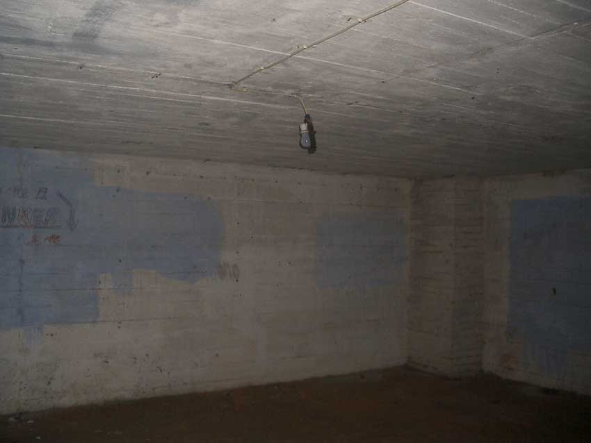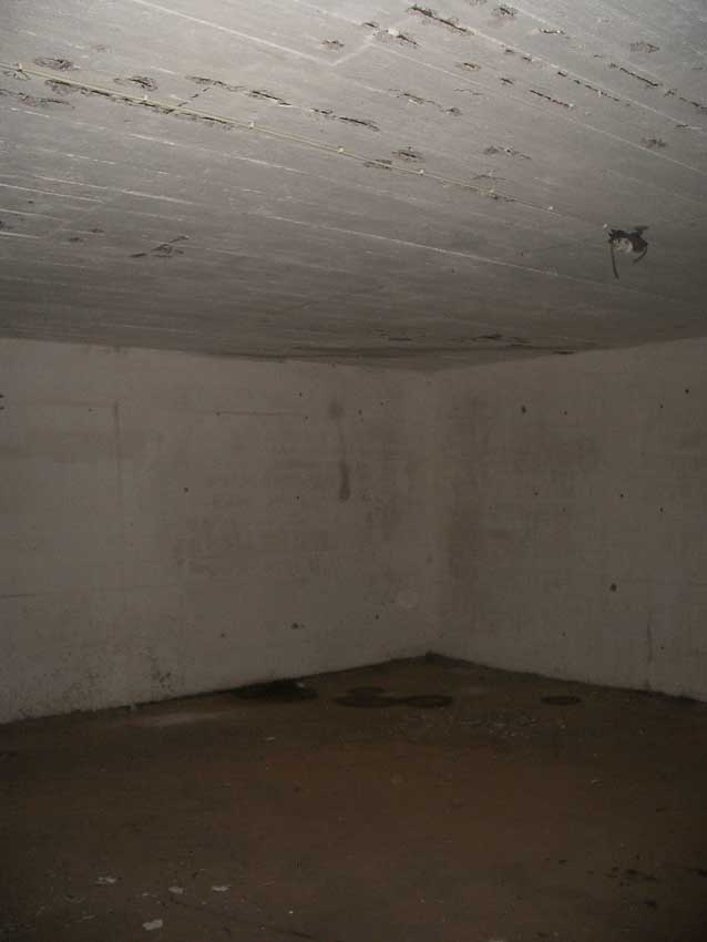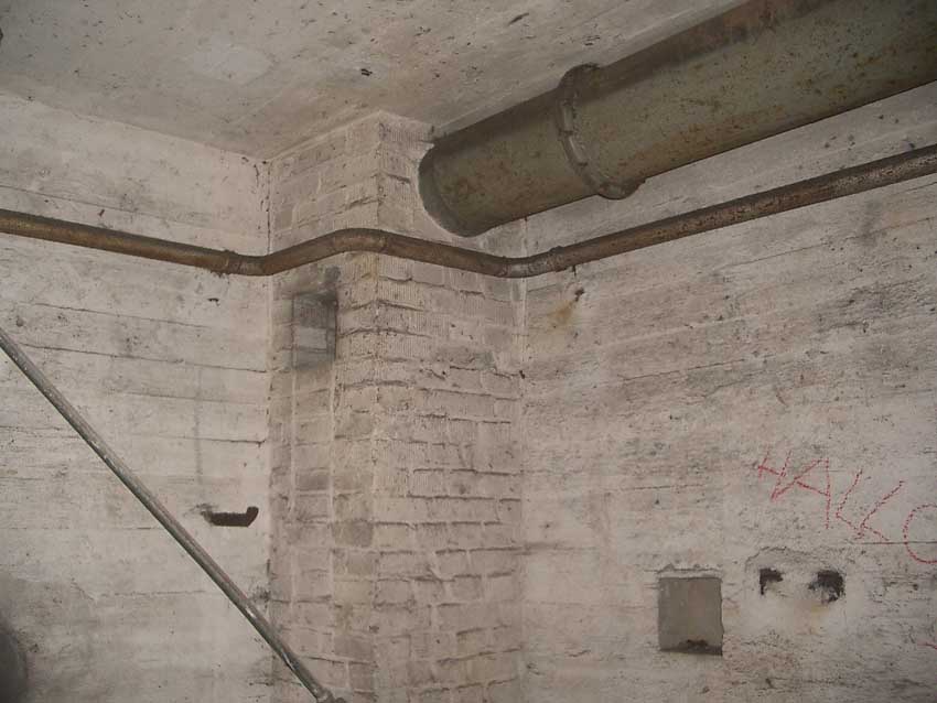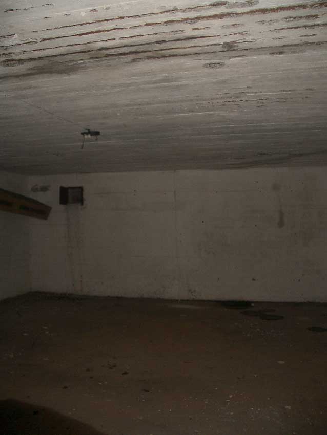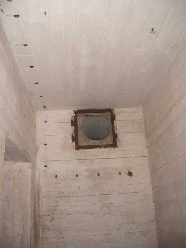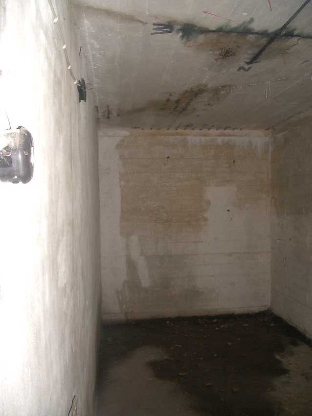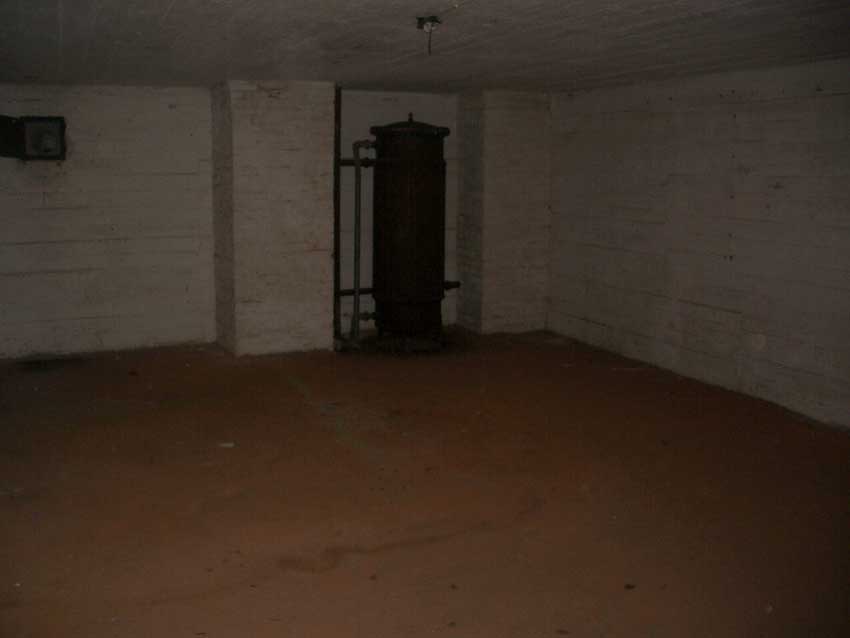 Anmerkung: Bei diesem Tank handelt es sich um ein offenes Ausdehnungsgefäß. Es gehörte zur Heizungsanlage und stellte den höchsten Punkt dar. Es wurde Wasser aufgefüllt, bis der Behälter überlief. Das sich beim Aufheizen ausdehnende Wasser tropfte aus dem Überlauf. Im Betrieb stellte sich ein bestimmter Pegel ein. Von Zeit zu Zeit musste verdampftes Wasser wieder ergänzt werden. Man erkennt sehr gut die drei Anschlüsse: Vorlauf, Rücklauf und Sicherheitsüberlauf. Alle Truppenmannschaftsbunker besaßen in der obersten Ebene diesen Tank.