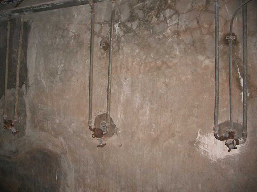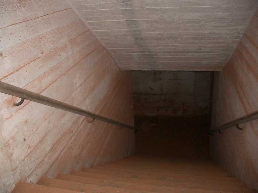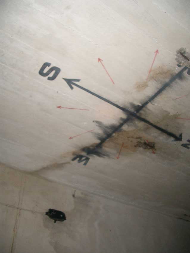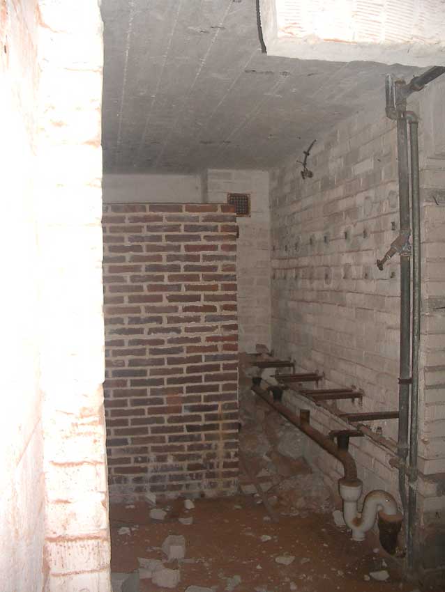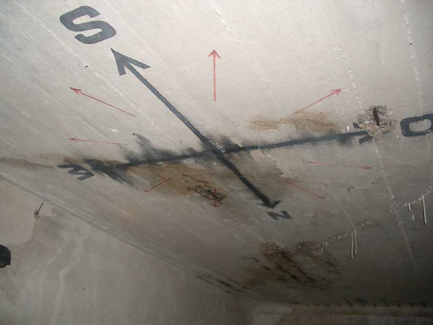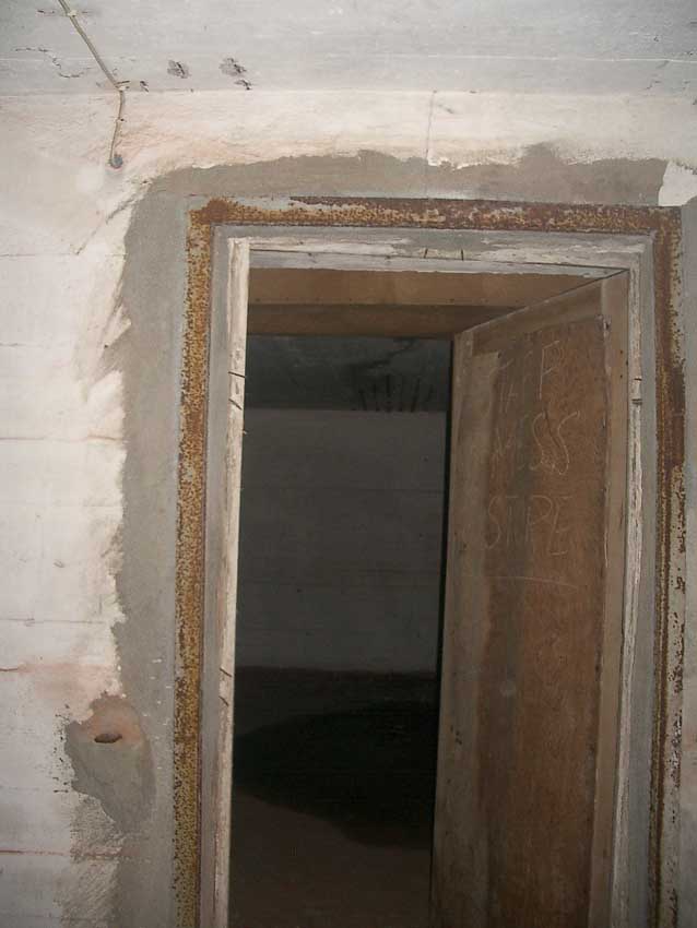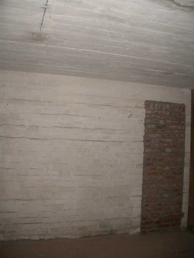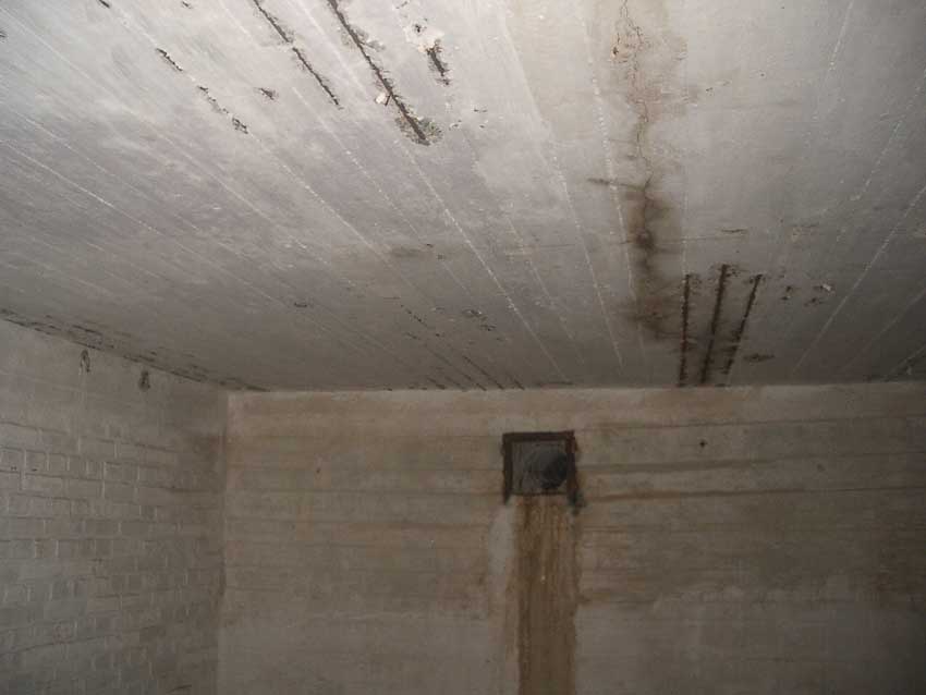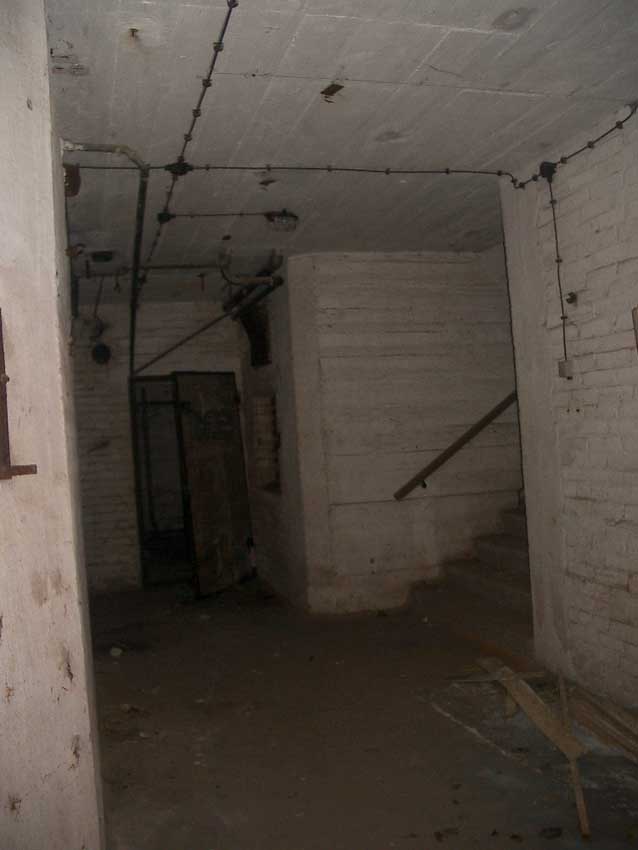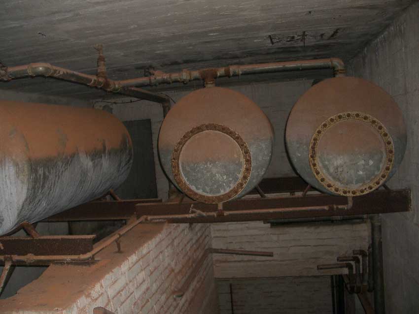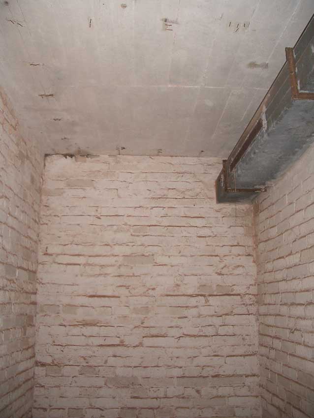 Anmerkung: Bei diesem Tank handelt es sich um ein offenes Ausdehnungsgefäß. Es gehörte zur Heizungsanlage und stellte den höchsten Punkt dar. Es wurde Wasser aufgefüllt, bis der Behälter überlief. Das sich beim Aufheizen ausdehnende Wasser tropfte aus dem Überlauf. Im Betrieb stellte sich ein bestimmter Pegel ein. Von Zeit zu Zeit musste verdampftes Wasser wieder ergänzt werden. Man erkennt sehr gut die drei Anschlüsse: Vorlauf, Rücklauf und Sicherheitsüberlauf. Alle Truppenmannschaftsbunker besaßen in der obersten Ebene diesen Tank.