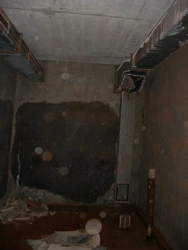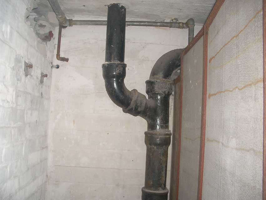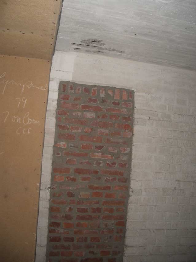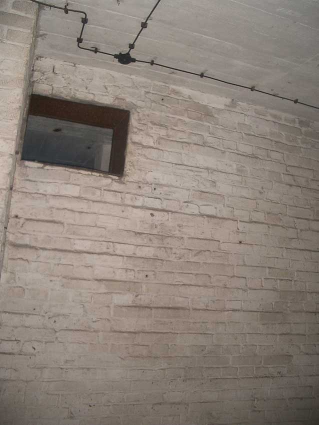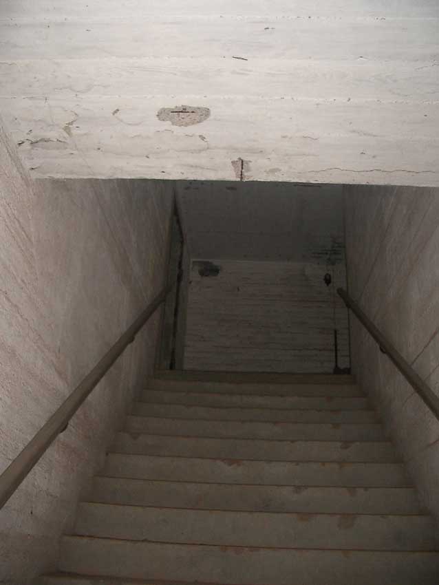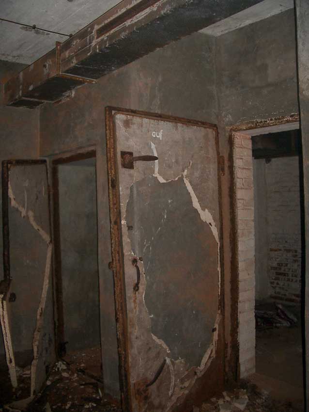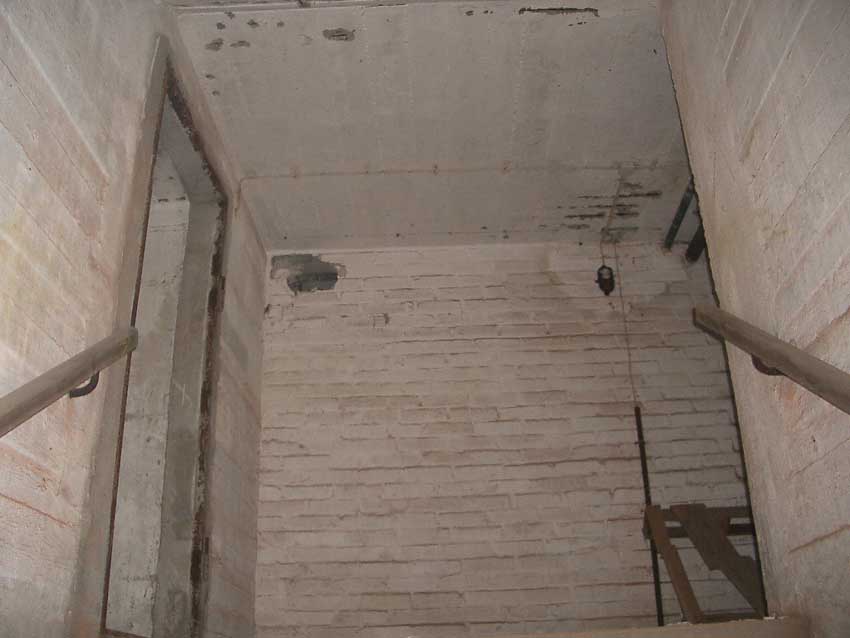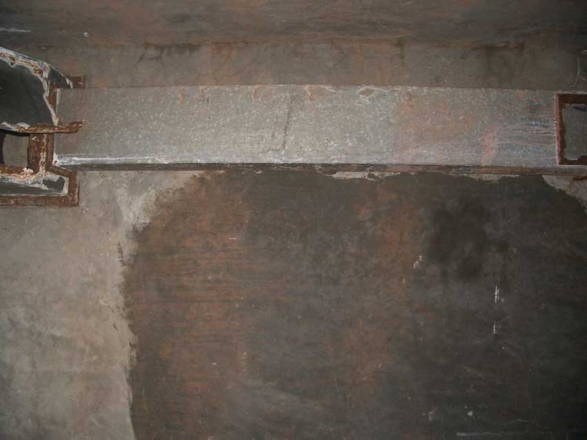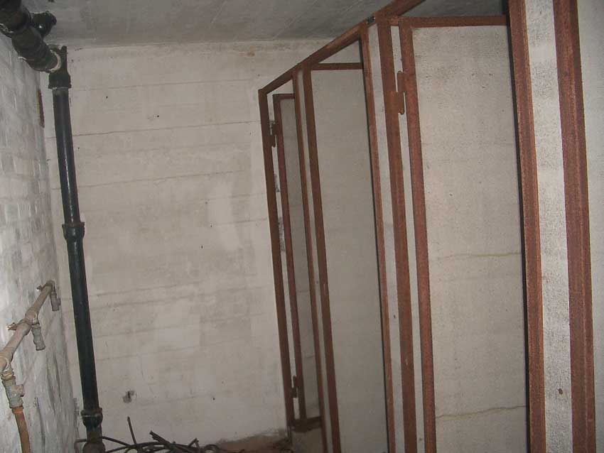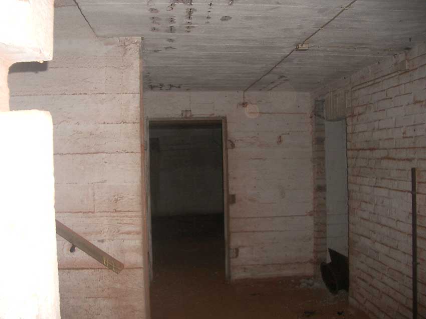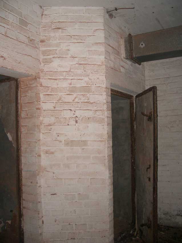 Anmerkung: Bei diesem Tank handelt es sich um ein offenes Ausdehnungsgefäß. Es gehörte zur Heizungsanlage und stellte den höchsten Punkt dar. Es wurde Wasser aufgefüllt, bis der Behälter überlief. Das sich beim Aufheizen ausdehnende Wasser tropfte aus dem Überlauf. Im Betrieb stellte sich ein bestimmter Pegel ein. Von Zeit zu Zeit musste verdampftes Wasser wieder ergänzt werden. Man erkennt sehr gut die drei Anschlüsse: Vorlauf, Rücklauf und Sicherheitsüberlauf. Alle Truppenmannschaftsbunker besaßen in der obersten Ebene diesen Tank.
