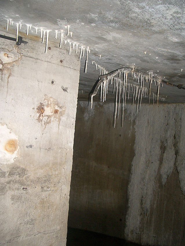 Tropfsteine und Original-Stromkabel im stark unter Wasser stehenden Hauptraum. Die Decke ist undicht, wie die Tropfsteine beweisen...