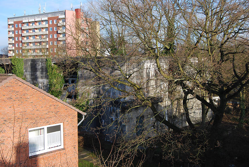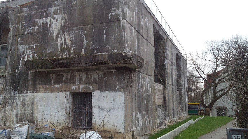 Hochbunker Gorch-Fock-Straße ("Gorch-Fock-Bunker") (nicht fertig gestellt), nach dem Krieg entfestigt und später lange Zeit ungenutzt: