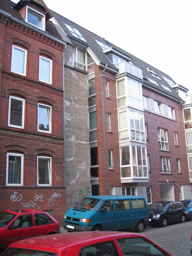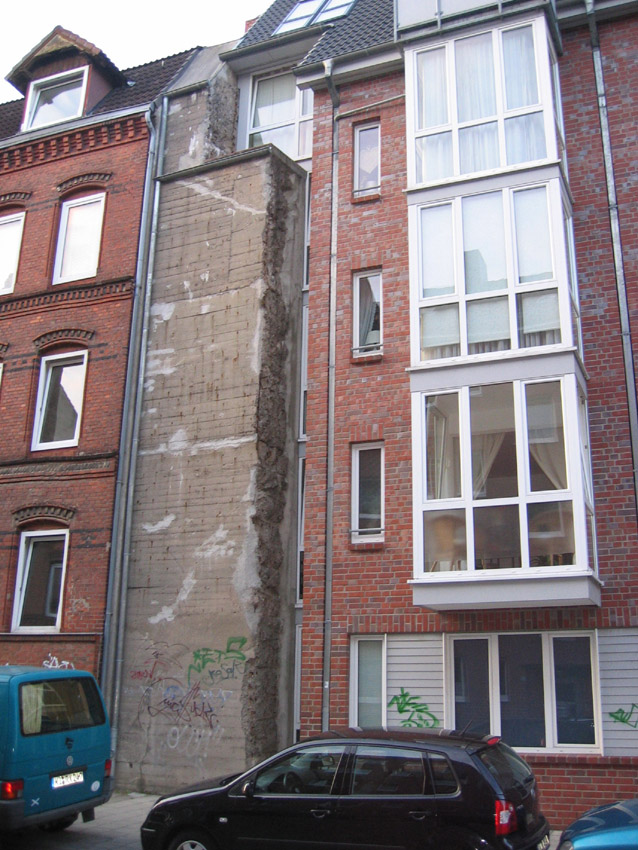 Hochbunker Jungmannstraße ("Jungmann-Bunker 1"), nach dem Krieg gesprengt und später bis auf die hintere, am Wohnhaus anliegende Wand entfernt (statische Gründe):