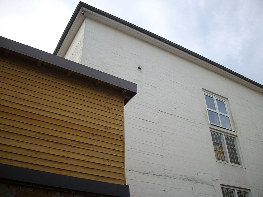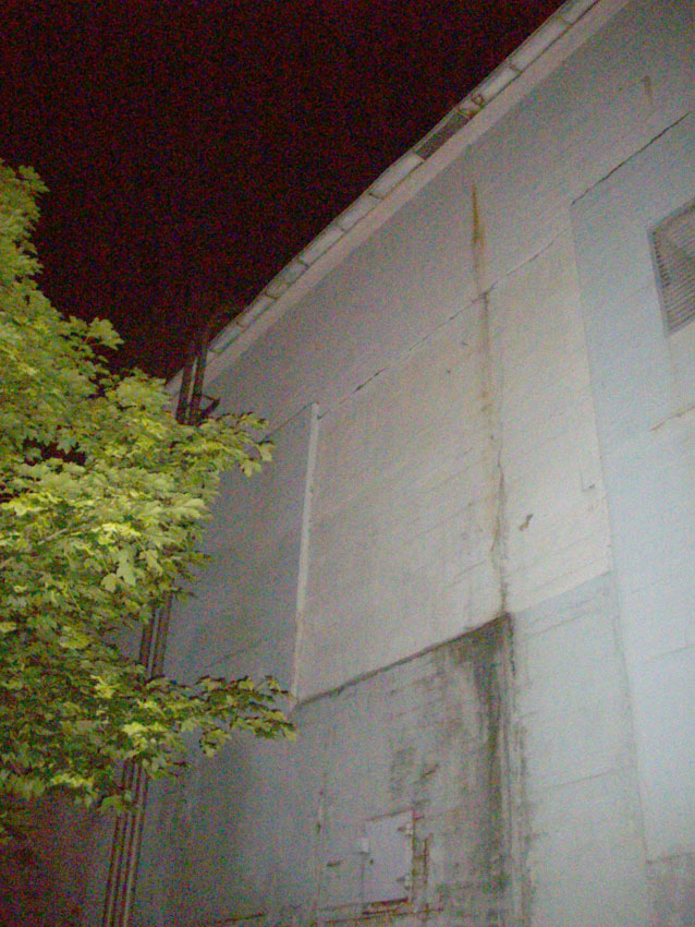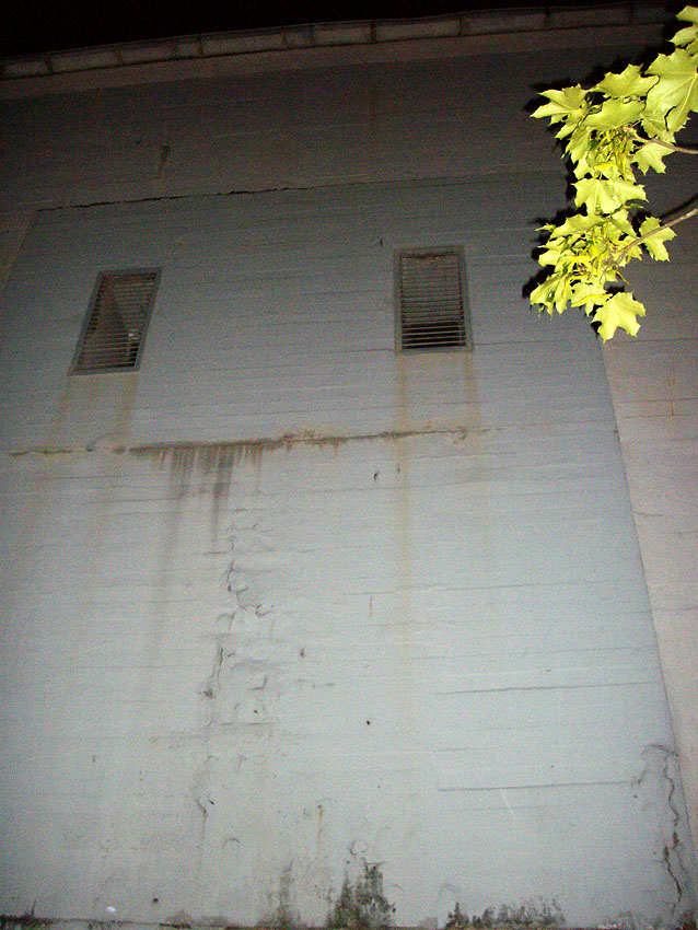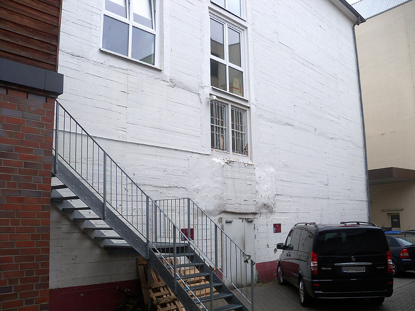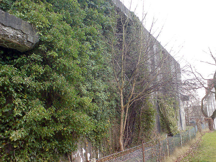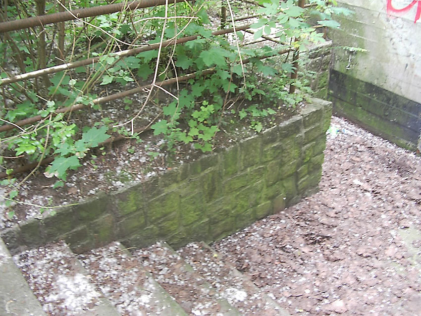 Die Bauform des herausragenden Betons und die Verklinkerung sind ähnlich der Erscheinung des anderen zugemauerten Einganges, welcher von der Straße aus sichtbar ist.