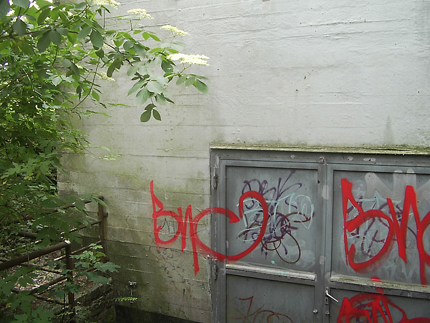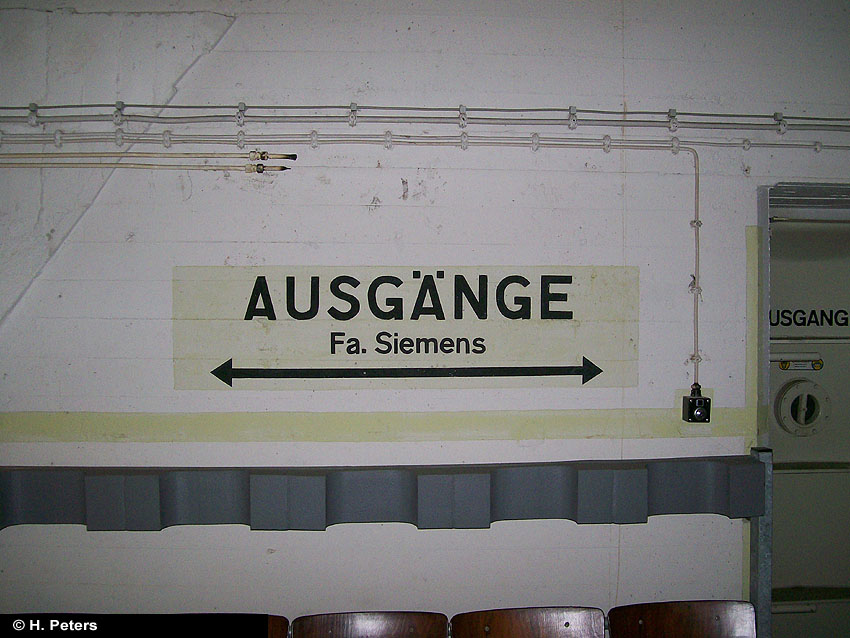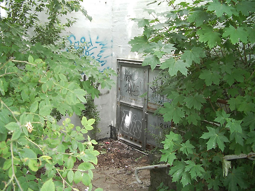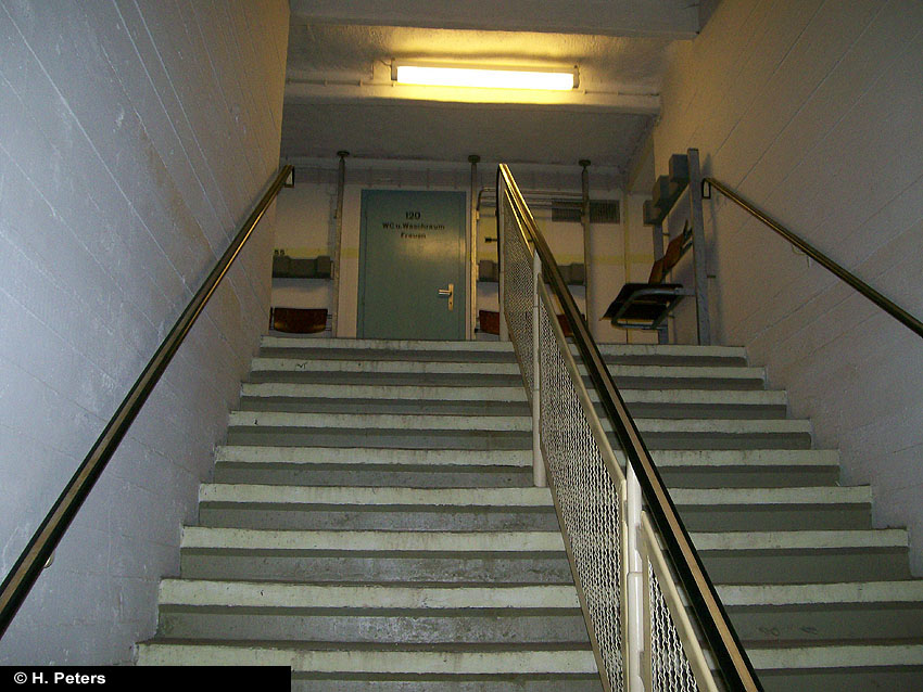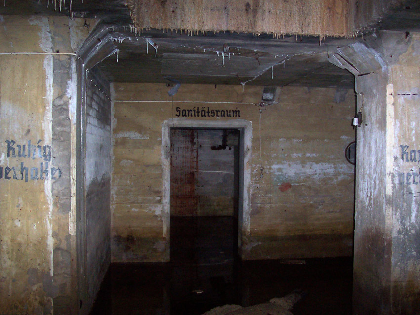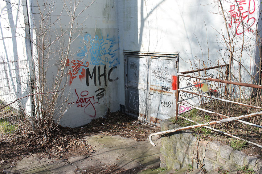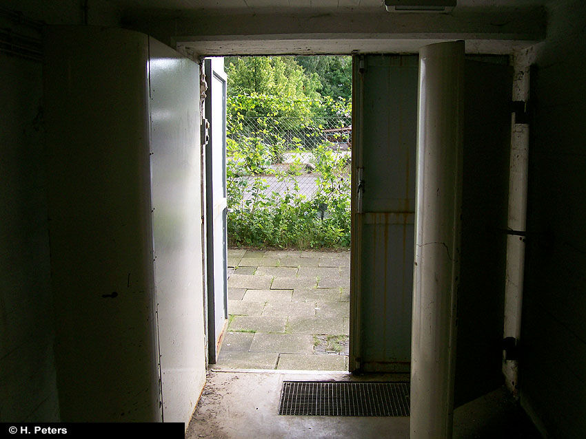 Der auf dem oberen Bild erkennbare Eingang ist intakt - es führt eine Treppe ca. 20 Stufen hinab, unten steht das Wasser knietief. Dann folgt eine Mauer, diese ist nur 1,2 - 1,3 m hoch, der Rest steht unter Wasser. Die Mauer hat ein großes, rechteckiges Loch in der Mitte. Es ist noch die Aufschrift "Zu den Schutzräumen" zu erkennen. Es gibt noch 3 weitere Eingangsbauwerke, diese sind verklinkert. Eines ist von der Straße aus zugänglich, allerdings ist es zugemauert worden: