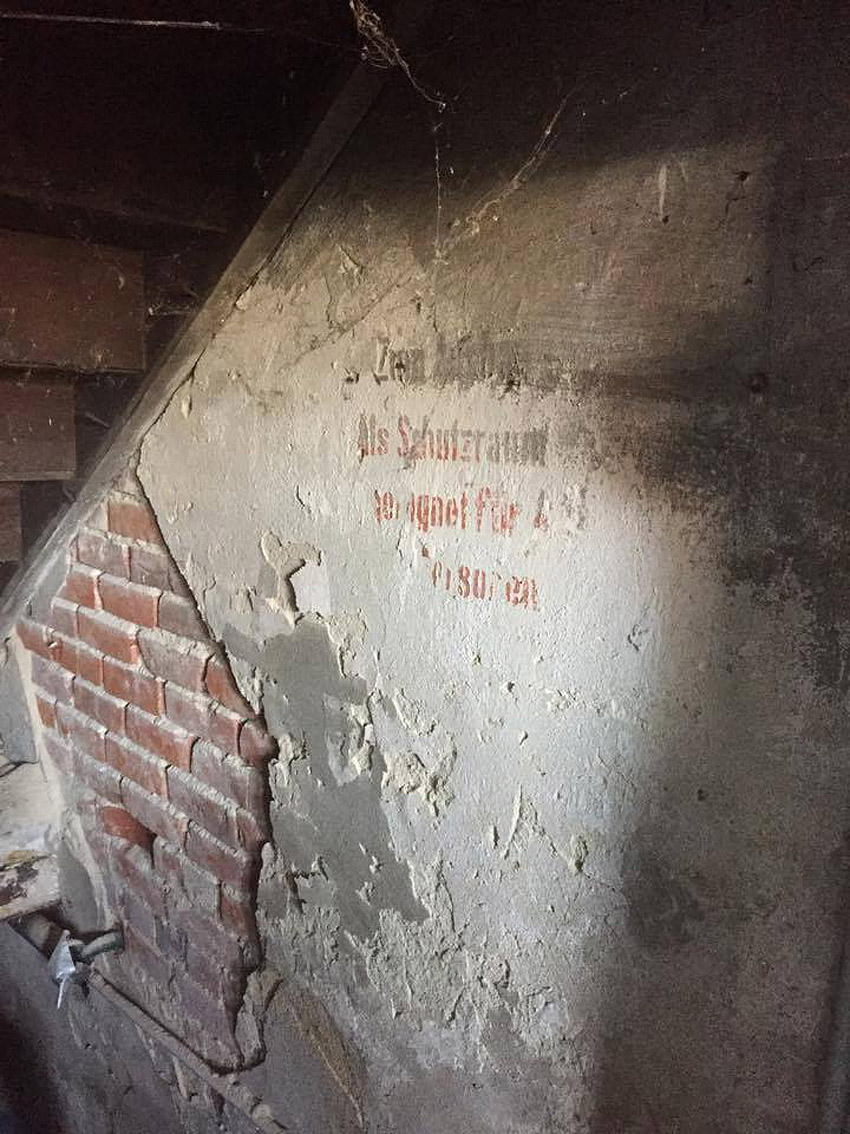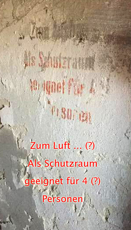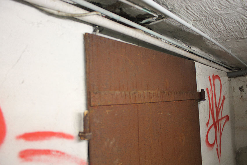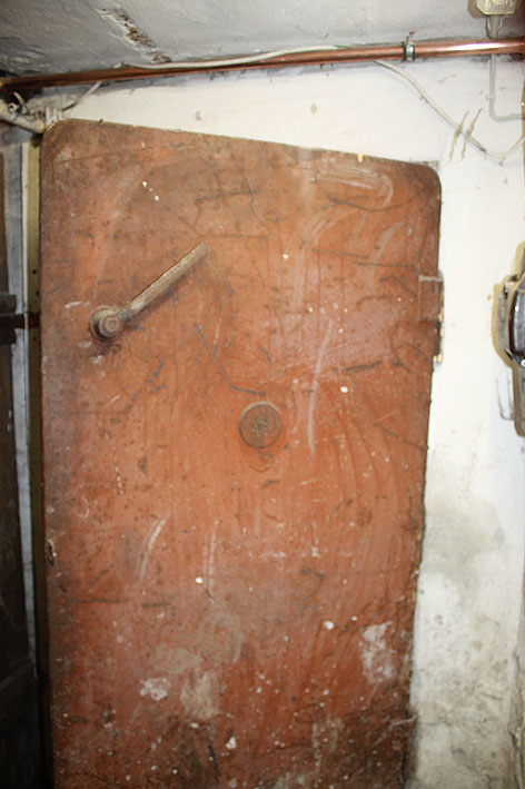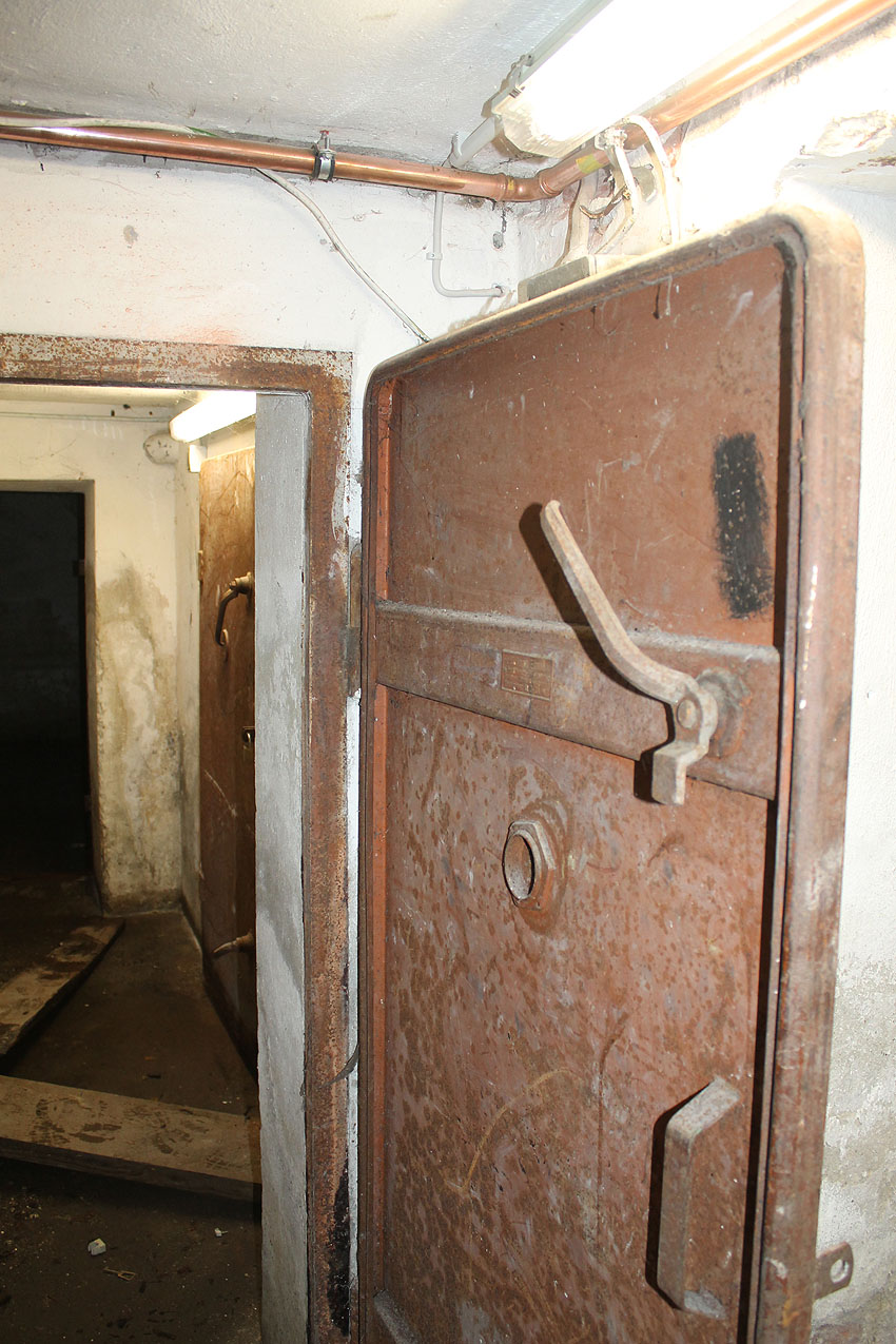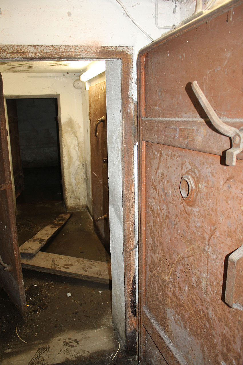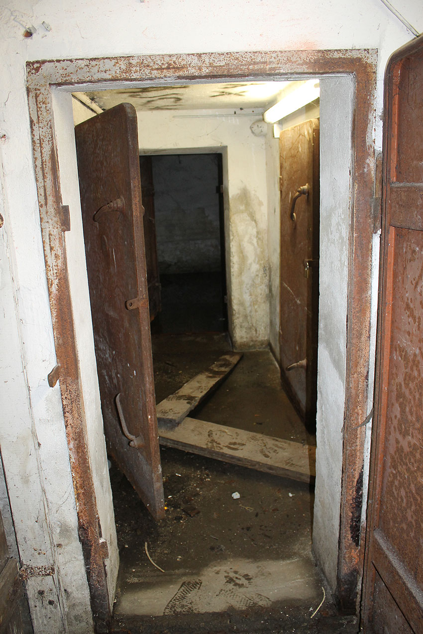 Heutiger Bestand (Stand September 2017): Neben dem in der Aufnahme erkennbaren Schriftfeld ein Soll-Mauerdurchbruch zwischen beiden Häusern und zwei noch vorhandene Druckschutztüren.