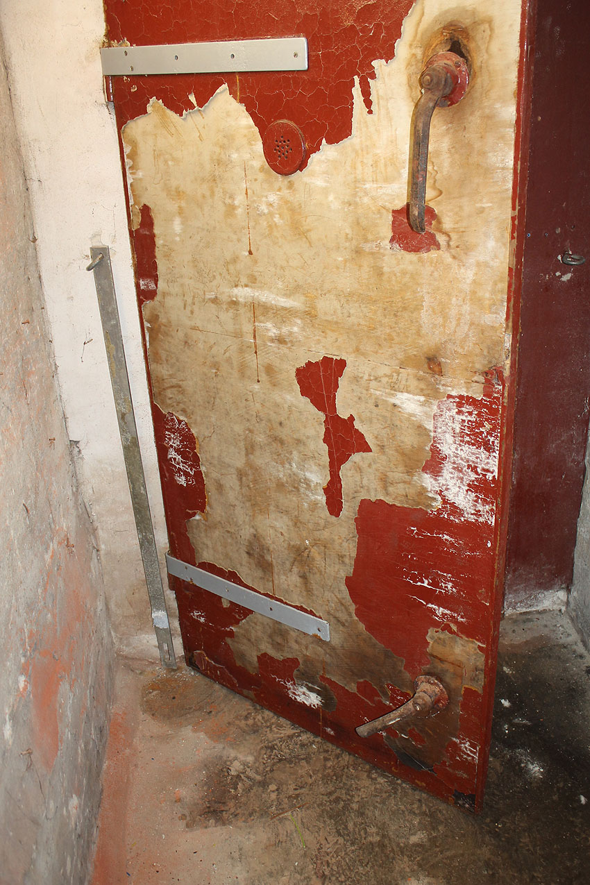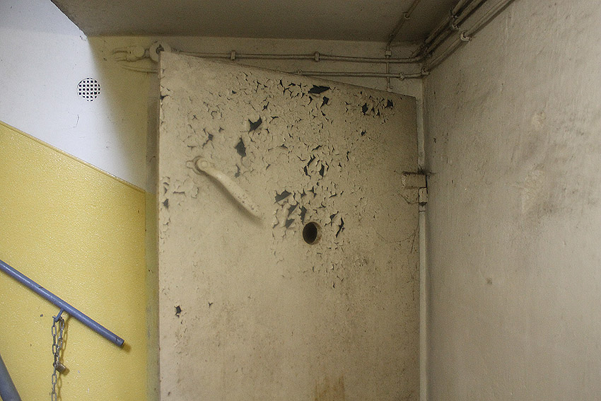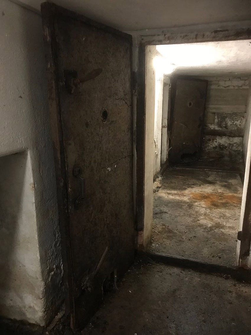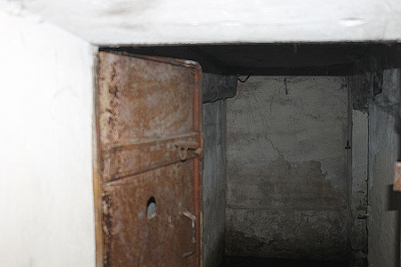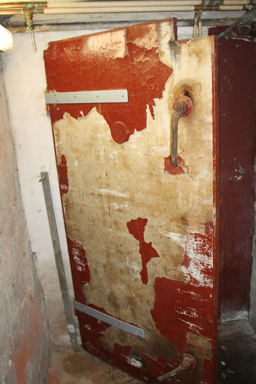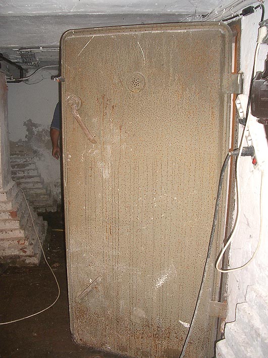 Heutiger Bestand (Stand September 2017): Neben dem in der Aufnahme erkennbaren Schriftfeld ein Soll-Mauerdurchbruch zwischen beiden Häusern und zwei noch vorhandene Druckschutztüren.