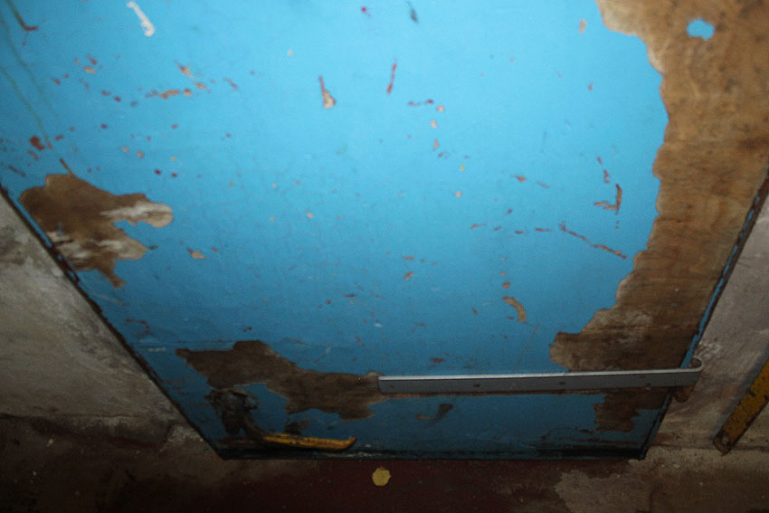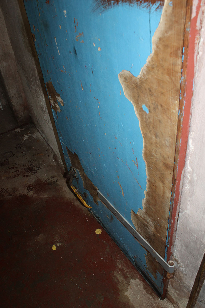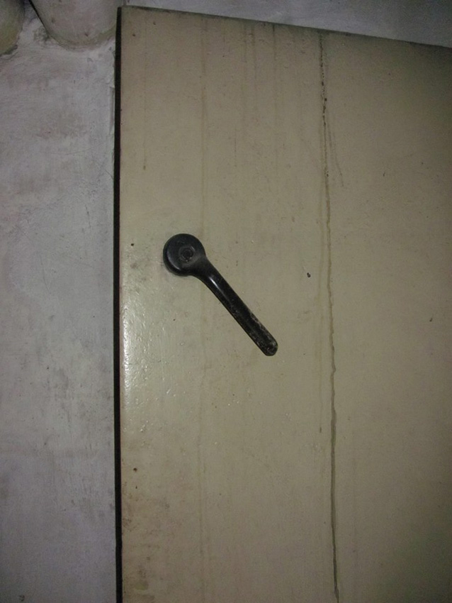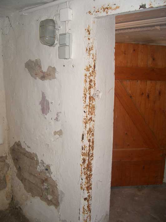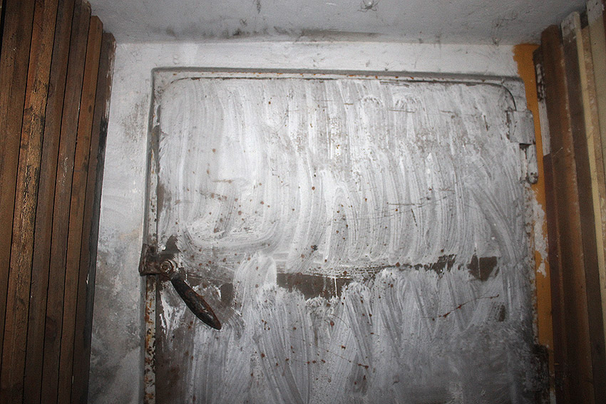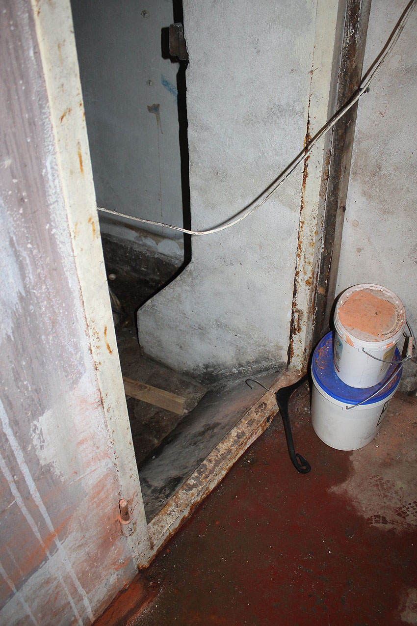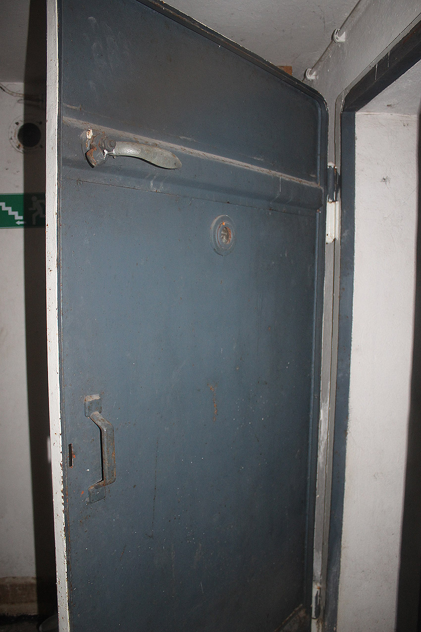 Heutiger Bestand (Stand September 2017): Neben dem in der Aufnahme erkennbaren Schriftfeld ein Soll-Mauerdurchbruch zwischen beiden Häusern und zwei noch vorhandene Druckschutztüren.