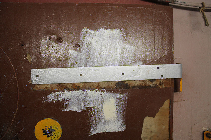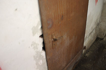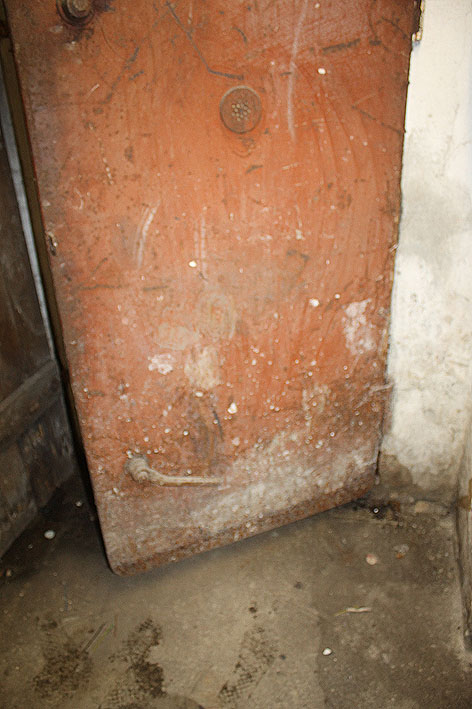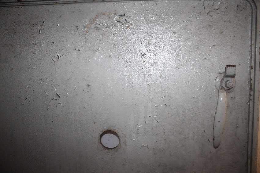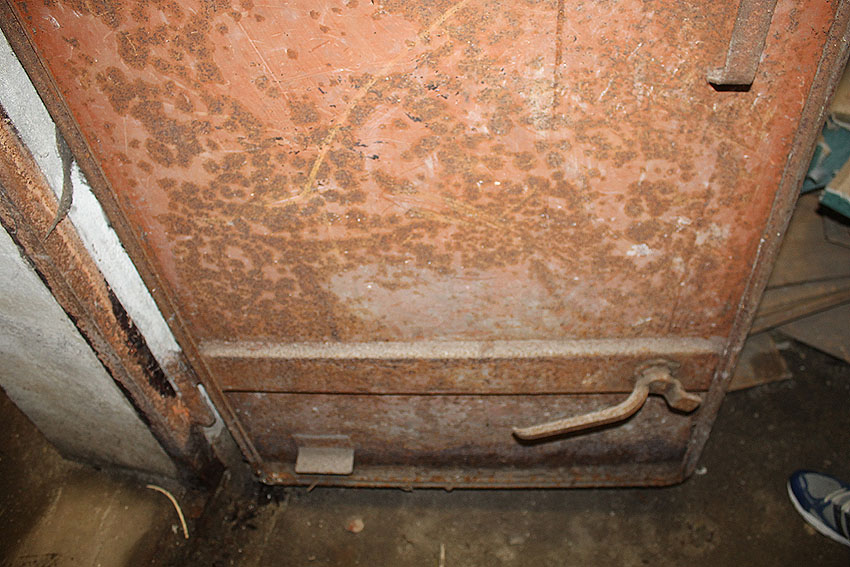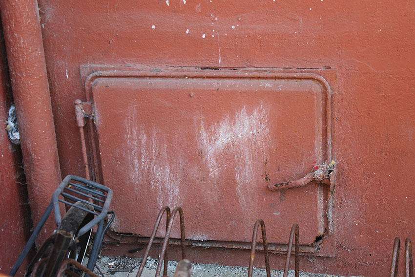 Verschlossene Tür / dahinter äußerlich am Kellerfenster angebrachte Stahlklappe: