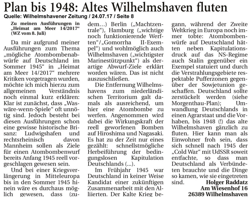 STELLUNGNAHME - Am 24. Juli 2017 erschien der hier abgebildete Leserbrief von Herrn H. Raddatz in der Tagespresse. - Am 31. Juli erschien ein Antwort-Leserbrief dazu von Herrn Dr. J. Graul, in welchem insbesondere die Aufführung der Jahreszahl "1948" kritisiert worden ist. - Um die Glaubwürdigkeit des Leserbriefes vom 24. Juli nicht zu beschädigen und zum allgemeinen Verständnis hierzu nachfolgende Stellungnahme. Eine Veröffentlichung des Textes in der Tagespresse war leider nicht möglich.