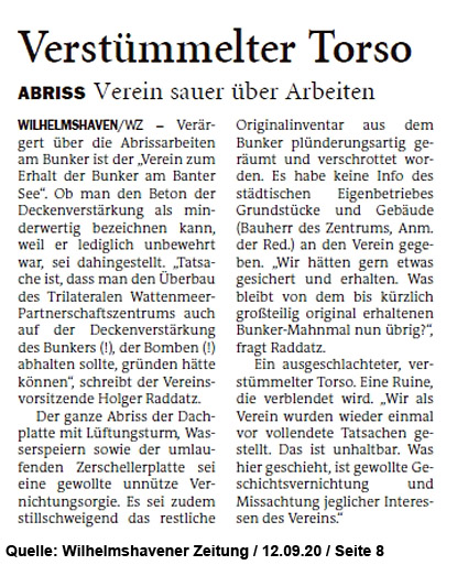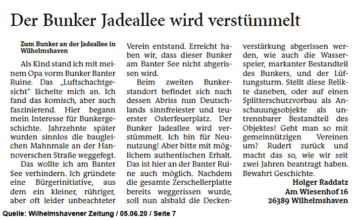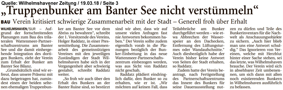 Ostfriesland-Magazin 01.11.19: In der Novemberausgabe vom "Ostfriesland-Magazin" erschien ab Seite 28 ein Artikel über die Bunker in Wilhelmshaven, auch über die Truppenmannschaftsbunker der Stadt ("Tonnenschweres Erbe einer Kriegsvergangenheit. Wie in Wilhelmshaven auf alten Bunkern neues Leben entsteht."). Wilhelmshavener Zeitung 05.06.20: